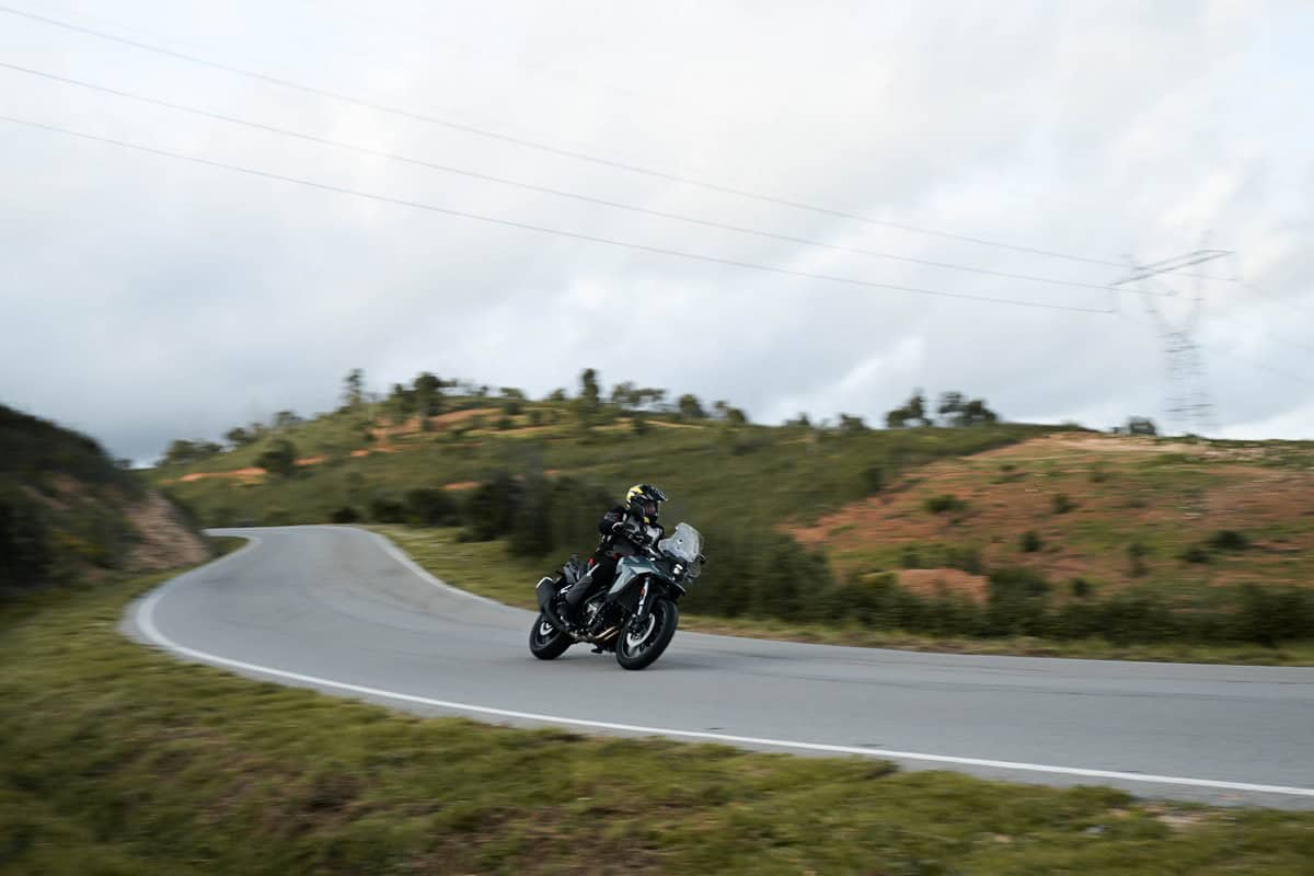 Het is niet alleen de toch zo relatief bescheiden twin die de V-Strom 800 zo’n rappe stuurfiets maakt, het rijwielgedeelte en de remmen dragen ook hun steentje bij. Die laatste grijpen lekker stevig aan en dat is fijn. Te veel allroads krijgen net iets te behoudende remmen voor op straat. De vering levert in vergelijk met een DE niet alleen in qua millimeters veerweg, maar ook qua instelbaarheid. Het kwam… geen moment ter sprake. Ook de V-Strom heeft de afstelling prima voor elkaar. De Portugese wegen kunnen nog wat leren van de Spaanse als het op strakheid aangaat. Bovendien zagen we regelmatig grote stofwolken onder het achterwiel van de voorganger vandaan komen. Eventuele zorgen om grip bleken echter volledig overbodig. Lekker als een motorfiets in vertrouwen grossiert. Wat de V-Strom nog meer biedt? Een heerlijke combinatie van comfort en wegligging. De wegen golven hier regelmatig, het zijn geen bulten, maar het is eerder alsof het asfalt een rustig golvende zee imiteert. De relatief soepele vering slikt die ‘golven’ moeiteloos, de vering deint niet door en bewaakt direct weer de rust. Dat het insturen nog niets makkelijker verloopt dan op een DE is eenvoudig verklaarbaar: kortere wielbasis, kleiner voorwiel en, minder gewicht klaren die klus.