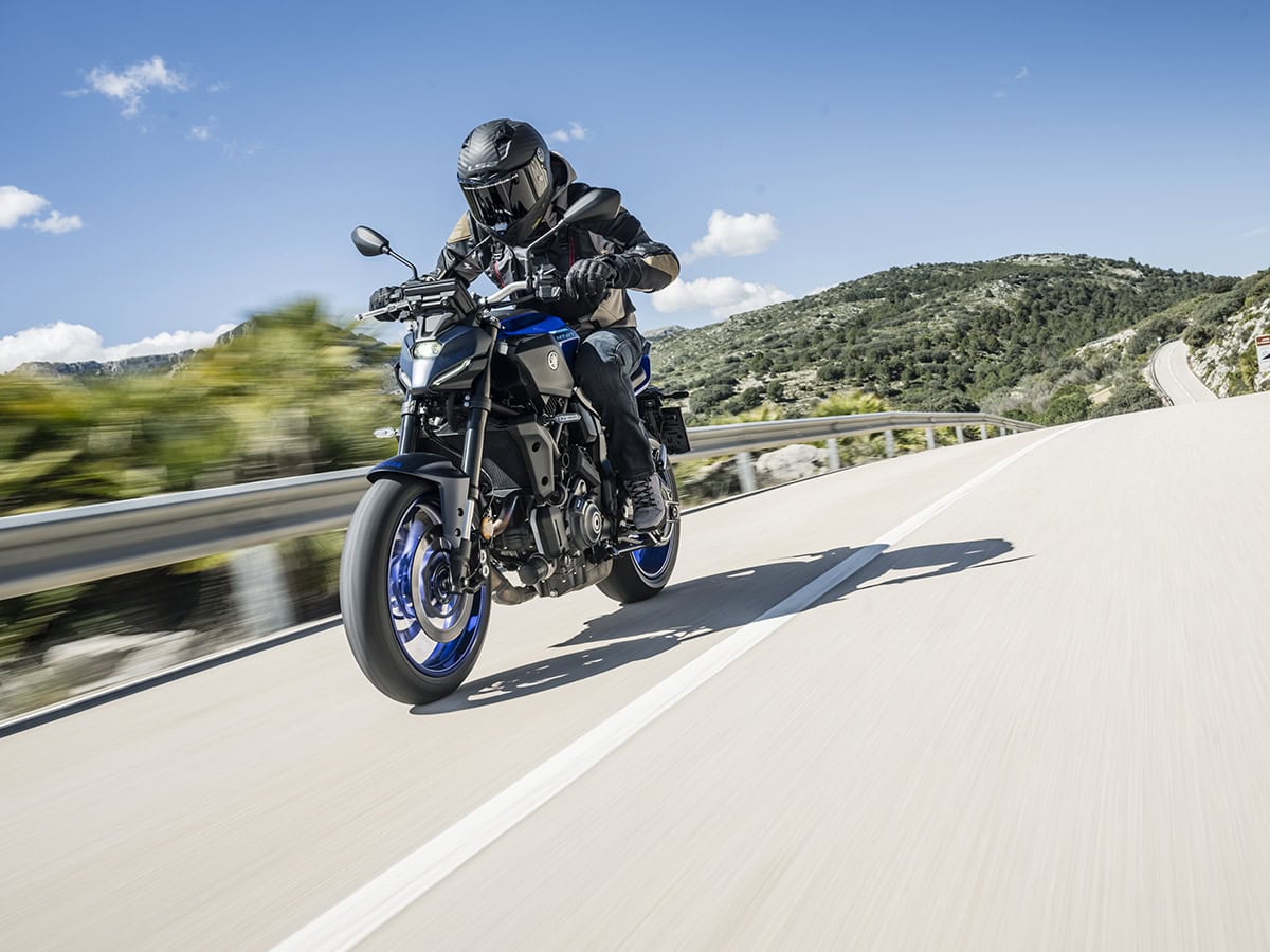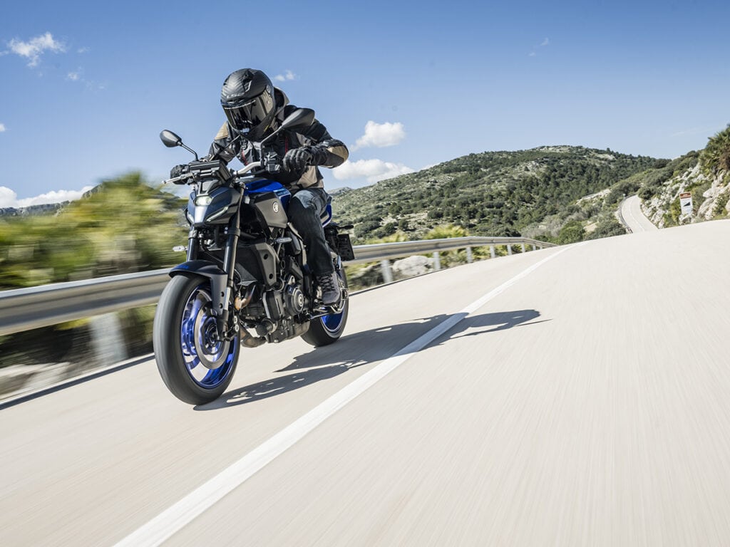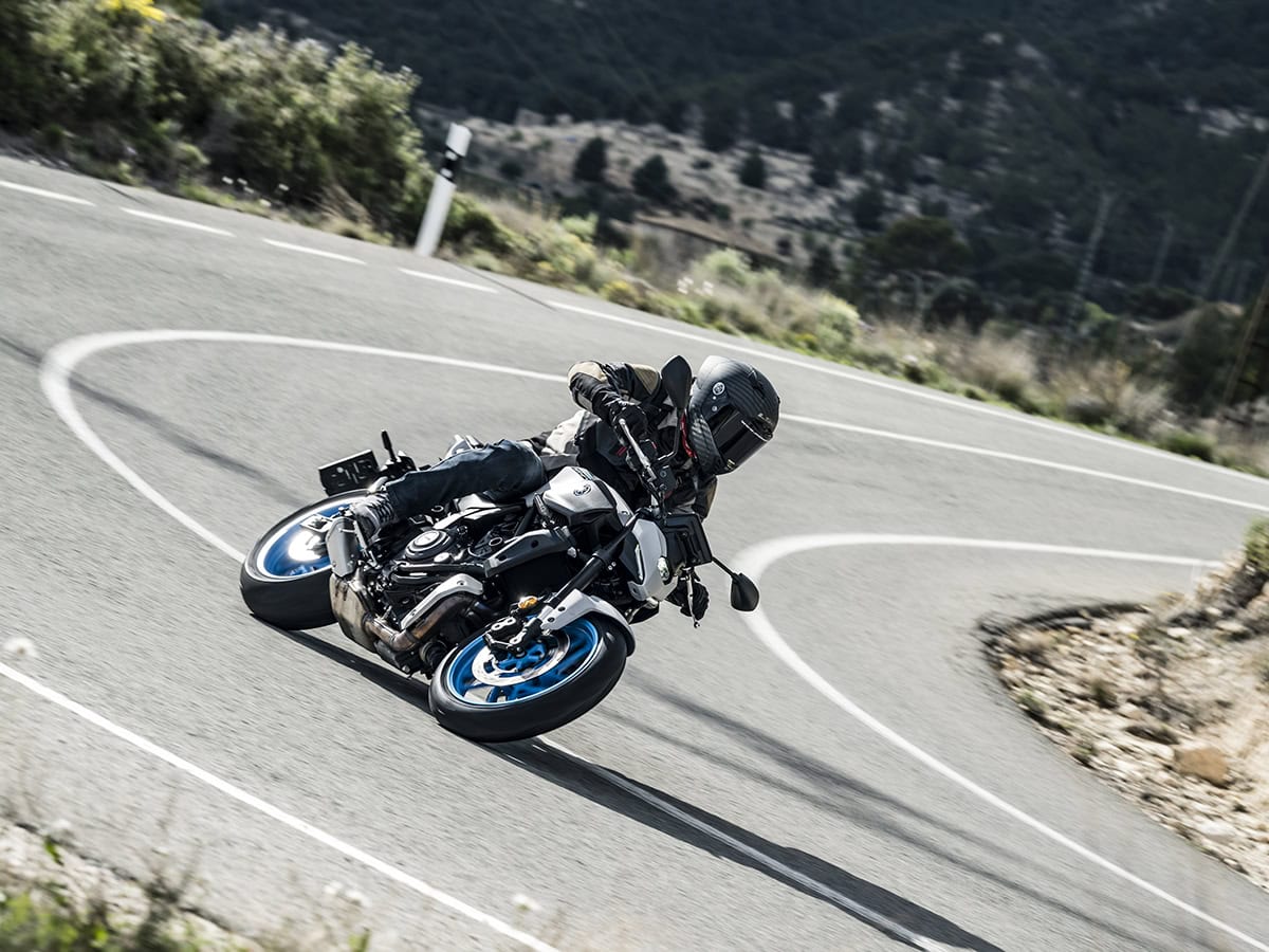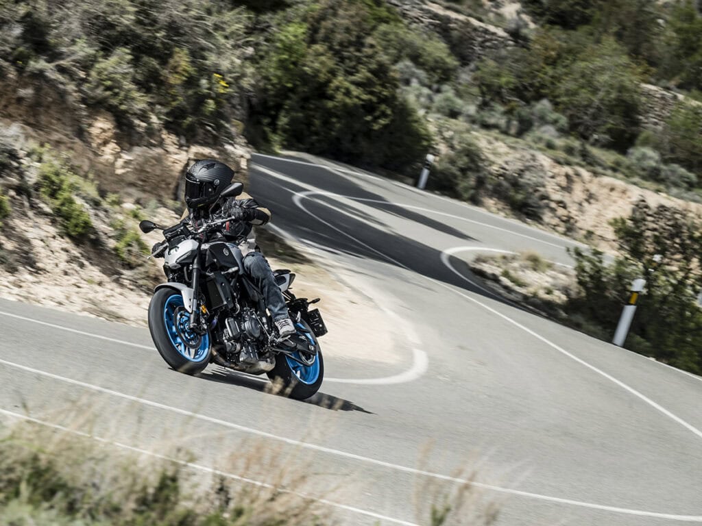 Maar de eerlijkheid gebiedt te zeggen dat de MT-07 van nature al haast intuïtief naar de juiste lijn in een bocht duikt. Daarin blinkt deze enorm wendbare opstapper weer als vanouds uit, waarbij hij gevoelsmatig tot op de millimeter nauwkeurig te dirigeren is en zich met meer dan speels gemak van het ene op het andere oor laat leggen. Met een licht gewijzigde geometrie (fractioneel steilere balhoofdhoek en iets kortere wielbasis) is het geheel nog nadrukkelijker op handelbaarheid afgestemd, zonder ook maar een moment nerveus aan te voelen. De nieuwe standaard banden (Dunlop Sportmax Q5A) hebben even opwarmtijd nodig, maar voelen daarna al snel vertrouwd aan en zullen bij alledaags gebruik niet snel in negatieve zin verrassen. Enkel bij sportiever gebruik en op minder grip biedend asfalt zou de feedback met name voor wat helderder mogen zijn.