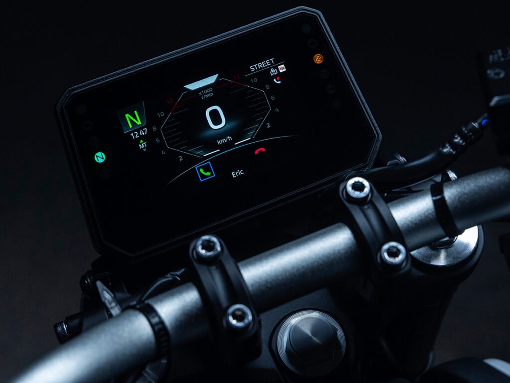 De gekozen rijmodus en alle andere relevante rij-info wordt je voorgeschoteld op een van de MT-09 afkomstig 5 inch TFT-display met vier verschillende thema’s én connectiviteitsopties met een smartphone middels Yamaha’s MyRide-app. Ook kan het display middels de Garmin StreetCross-app worden omgetoverd in een full map navigatiesysteem.