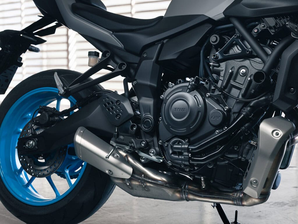 Wennen hoef je niet aan de heerlijk acterende twin van de MT-07, net als voorheen toch wel weer de ster van de show, en door de krukas-layout acterend als een roffelende V-twin. Net als bij de MT-10 en ook de MT-09 heeft Yamaha op het inlaatgeluid van de paralleltwin ook een stukje ‘sound engineering’ losgelaten. Afmeting en vorm van een aantal inlaatcomponenten, waaronder het luchtfilter, luchtinlaten en inlaatcovers, zijn geoptimaliseerd om via vier openingen in de tankcover, vlak voor tank en zadel in elkaar overgaan, het inlaatgeluid in versterkte vorm naar de rijder te geleiden, met name bij het uitaccelereren van van langzamere bochten met 25 tot 50 procent gasopening. Het is hoorbaar, maar minder duidelijk dan op de MT-10 waar die openingen zich meer aan de voorzijde van de tank bevinden, daar waar je hoofd ook meer boven hangt tijdens het rijden.