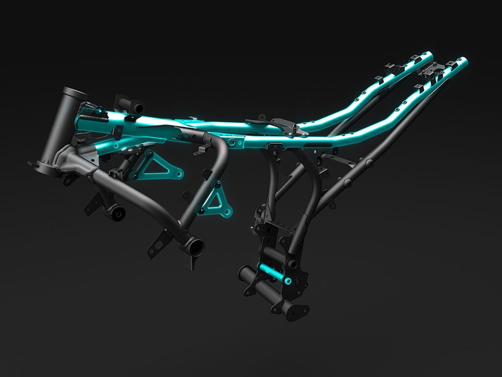 Het frame weegt net als voorheen bijna 15 kilo, maar is wel flink op de schop gegaan en is afgezien van het balhoofd op nagenoeg alle vlakken gemodificeerd en 12 tot 13 procent stijver dan dat van het vorige model. De dikte en diameter van de stalen buizen zijn op veel punten herzien en met name het scharnierpunt van de swingarm is volledig anders uitgevoerd. Ook de asymmetrische stalen achterbrug zelf is licht aangepast. Die aanpassingen aan het frame voerde Yamaha niet alleen door omwille van de stuureigenschappen van de MT-07, maar ook om plek te bieden aan het YCC-T-systeem, én het optionele, eind vorig jaar al op de MT-09 gelanceerde Y-AMT-systeem, zonder daarbij concessies te doen aan de 14 liter tankinhoud en de capaciteit van het luchtfilterhuis.