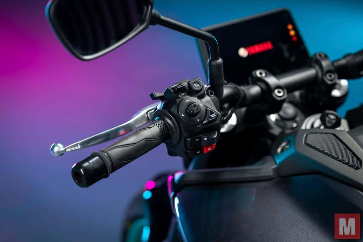 Voor het bedienen van dat dashboard kreeg de driecilinder een volledig nieuw, instrumentencluster op de linker stuurhelft aangemeten, met twee aparte knoppen voor het bedienen van de nieuwe cruise-control en een tuimelschakelaar/joystick en home-knop voor de rest. Daarmee laten alle hulpsystemen zich nu op uiterst intuïtieve wijze instellen, de hele logica achter de menustructuur heb je echt binnen drie minuten helemaal doorgrond. Fervente fervente aanhangers van de digitale goden kunnen de instellingen echter ook middels de MyRide-app naar eigen wens instellen. Nu we het toch over het elektronicapakket hebben, deze is nog verder uitgebreid/verfijnd en luistert nu naar de naam Yamaha Ride Control (YRC). Waar op het afzwaaiende model alle hulpmiddelen apart van elkaar moesten worden ingesteld, beschikt de nieuwe over drie standaard rijmodi (Sport, Street en Rain) met elk een passend regelniveau van de vermogensafgite, tractiecontrole, slide-control, wheeliecontrole en hoeveelheid motorrem. In de twee extra Custom-modi kun je deze vijf zaken naar eigen voorkeur instellen. Nieuw is nu de BSR, back slip regulator, dat automatisch het motorremkoppel beperkt wanneer achterwiel blokkeert. Met name nuttig onder zeer gladde omstandigheden waarop ook de anti-hop koppeling geen weerwoord heeft. Daarmee zijn we er bijna, want de Japanse naked is ook nu standaard uitgerust met Emergency Stop Signaling (ESS), ofwel automatisch inschakelende waarschuwingslichten bij een noodstop, én de derde generatie up/down quickshifter, waarmee je ook met gesloten gas koppelingsloos kunt opschakelen en volgas een tandje terug.