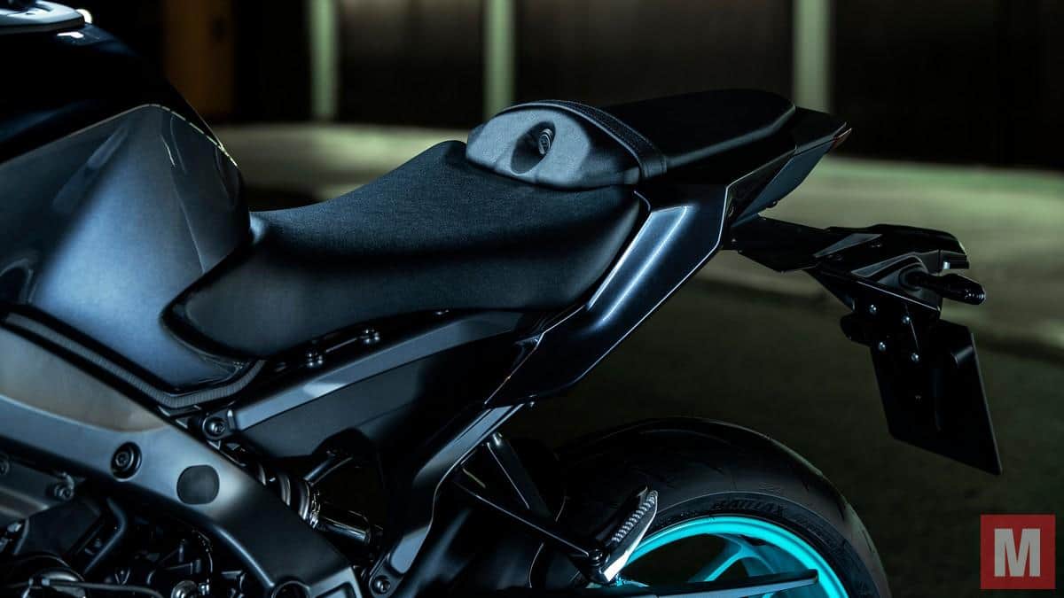 Zet de nieuwe naast zijn voorganger en dan lijkt veel hetzelfde, het bekende MT-DNA druipt er namelijk nog altijd vanaf. Maar kijk iets beter en je ziet dat er alleen al aan het design behoorlijk is geschaafd. Meest in het oog springend is zonder twijfel de nieuwe lichtunit aan de voorzijde. Het exemplaar van het 2021-model werd met nogal gemengde gevoelens ontvangen en daarom is de nieuwe variant waarschijnlijk iets minder uitgesproken, zonder aan karakter te hebben ingeboet. De lichtunit met de nu wat kleinere, centraal geplaatste koplamp met daarnaast twee positielichten, sluit ook wat mooier aan op de tank, die nu opvallend veel scherper is vormgegeven en gevoelsmatig beter aansluit bij het sportieve concept. Dat geldt ook voor het gedeelde zadel/duo-zadel (het uitlopende model heeft nog een ééndelige variant) en de mooi compact vormgegeven achterzijde. Het led-achterlicht is eveneens aangepast, met een rood glas aan de bovenzijde en getint glas onder. Alles bij elkaar oogt de nieuwe MT-09 gewoon net even wat scherper en moderner, frisser ook.