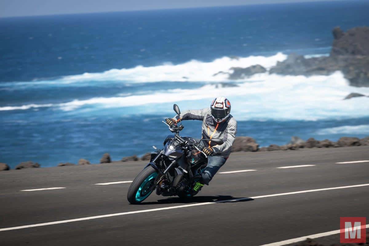 Een heel erg ruim toerenbereik heeft de CP3 niet, bij iets meer dan tienduizend toeren vindt de begrenzer het namelijk wel mooi geweest. Die hele bandbreedte is echter wel uiterst efficiënt bruikbaar. Van onderuit is het blok al heerlijk krachtig, om vervolgens vanaf iets onder de zesduizend toeren nog een flinke schep kolen extra op het vuur te gooien. Het maximum vermogen is bij tienduizend toeren beschikbaar, echt net voor de begrenzer ingrijpt. Surfend over de best wel drukke wegen van Lanzarote kom je daar echter maar zelden in de buurt. Liever maak je gebruik van die rijkelijke gevulde koppelkromme en schakelt, met dank aan de fantastische werkende quickshifter, snel en strak naar de volgende versnelling.