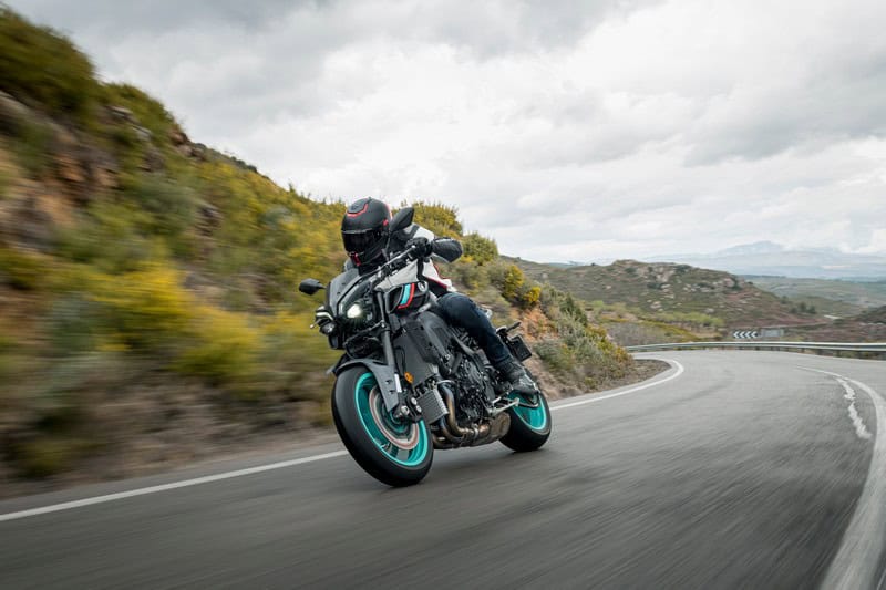 Tot zover in een notendop alle noviteiten en vernieuwingen, al zouden we het tandje minder op het achtertandwiel (42 in plaats van 43) bijna vergeten. Tijd om het been over het zadel te zwaaien. Dat is door 3 millimeter extra veervoorspanning op de achterschokdemper trouwens exact een centimeter hoger dan voorheen, 835 millimeter. Daarnaast is de tank rond de knieën heel iets slanker geworden, zonder dat dit ten koste ging van de inhoud, want in de tank gaat net als voorheen 17 liter. De zit zelf is iets meer voorover gebogen dan op de MT-09, maar nog altijd minder inspannend dan die op veel concurrenten. De 10 zit als je favoriete paar sneakers, als gegoten dus. Stuur en voetsteunen zijn ten opzichte van het zadel uitstekend gepositioneerd, en ook als je rond de 1.85 meter lang bent is de kniehoek niet onaangenaam krap. Ondanks het hoge stuur heb je het gevoel dat je behoorlijk dicht op het voorwiel zit, lekker actief en helemaal klaar voor het betere gooi- en smijtwerk op een uitdagende en 220 kilometer lange testroute door het achterland van Valencia.