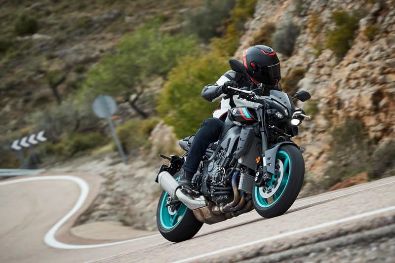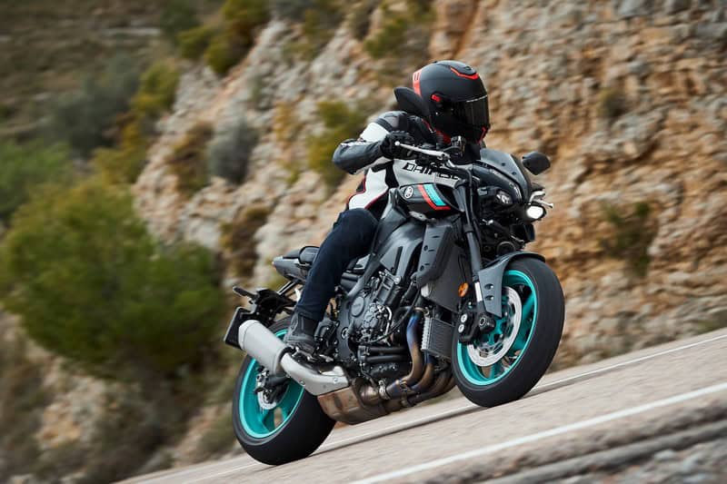 De volledig instelbare voorvork spreekt goed aan en strijkt hobbels mooi glad. Dat geldt in principe ook voor de achterschokdemper, waarvan de ingaande demping trouwens ook op high- en low-speed instelbaar is, maar deze reageert net even iets minder fijngevoelig op wat forsere oneffenheden. Zowel voor- als achterzijde zijn vrij stevig gedempt, wat voor een lekker vast gevoel en een strak stuurgedrag zorgt, maar het geheel voelt zeker niet overdreven hard aan. Bovendien is de grondspeling ruim bemeten, waardoor je niet heel snel iets aan de grond zult rijden. Waar de voorgaande generatie MT-10 onder koude en natte omstandigheden wat directheid bij het aangrijpen van de remmen ontbeerde en ook onder droge omstandigheden een niet altijd even duidelijk drukpunt had, is dat met de komst van de nieuwe radiale rempomp van Brembo verleden tijd. Deze zorgt voor een helder drukpunt, vraagt weinig handkracht en heeft een lekker stevige initiële beet. Ook bij meerdere harde remacties achter elkaar blijven de remmen consistent presteren en is er van fading geen sprake. Daarnaast lijken de regelintervallen van het ABS door een andere Bosch ABS-pomp iets minder grof dan voorheen.