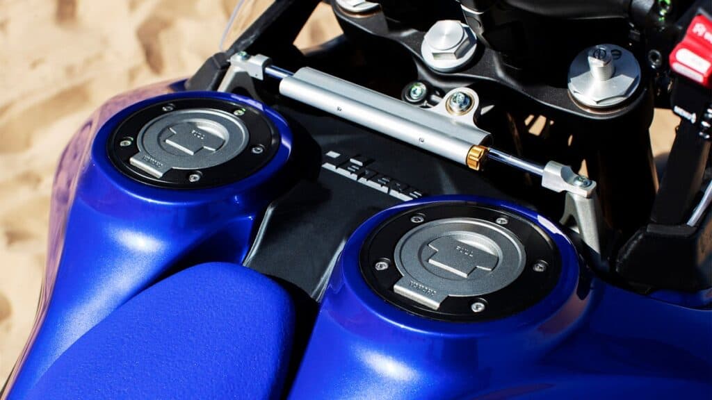 En wie nu nóg meer wil poetsen, wordt met de nieuwe World Raid-uitvoering op zijn wenken bedient. Deze na de Rally Edition alweer derde Ténéré-telg tilt het avontuurlijke karakter namelijk naar een nog hoger niveau. Zonder de ‘keep it simple’ strategie uit het oog te verliezen, biedt ‘ie van alles net even wat meer. Meer offroadcapaciteiten, iets rijkere uitrusting en bovenal meer actieradius. Dat laatste dankt de woestijnnomade aan de nieuwe, tweedelige tank die in totaal 23 liter brandstof achterover kan slaan. Goed voor etappes tot 500 kilometer, claimt de Japanse fabrikant, wat gezien het gemiddeld genomen weinige dorstige karakter van de 689cc-paralleltwin in theorie inderdaad makkelijk haalbaar lijkt. Door te kiezen voor twee separate tanks, konden deze wat lager gemonteerd worden, waardoor in combinatie met de eveneens wat lager gepositioneerd brandstofpomp het zwaartepunt nagenoeg identiek bleef aan dat van de standaardversie.
