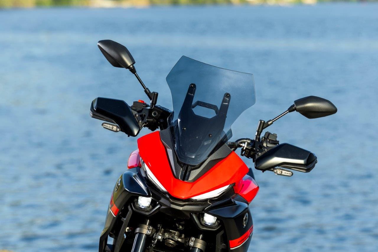 Wel klappert de ruit, die nu ook heel iets dikker is uitgevoerd, op de GT minder dan voorheen bij dergelijke snelheden. Beide ruitjes zijn met een handig verstelmechanisme in een handomdraai in hoogte te verstellen, ook tijdens het rijden, en bieden in de hoogste stand prima windbescherming. Wel is er dan met een rijder van 1.85 meter in het zadel enige turbulentie rond de helm voelbaar, maar dat verschilt vaak per persoon.
