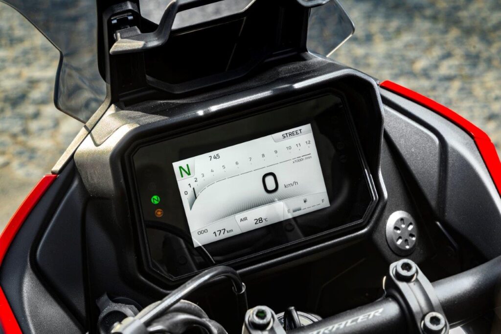 Onder de populariteit van zustermodellen als de MT-07 en Ténéré 700 mag de Tracer 7 misschien een beetje ondergesneeuwd lijken, maar sinds de lancering van het model in 2015 rolde ‘ie stiekem toch al meer dan 60.000 keer de showroom uit. Wat je noemt een stille kracht. Na eerdere updates in 2020 en 2023 volgt nu dus een nieuw model voor 2025. Niet zo gek natuurlijk, aangezien ook de MT-07 en Ténéré 700 voor dit modeljaar al zijn vernieuwd. In motorische zin volgt de nieuwe Tracer 7 zijn stalgenoten dan ook met de Euro5+-proof uitvoering van het bekende 689cc CP2-motorblok met zijn 270-graden-krukas. Met 73,4 pk vermogen bij 8.750 toeren en 68 Nm koppel bij 6.500 toeren zijn er geen wereldschokkende verschuivingen, was ook niet echt nodig, maar net als de MT-07 en Ténéré 700 heeft nu ook de Tracer 7 ride-by-wire, ofwel Yamaha Chip Controlled Throttle (Y-CCT). En daar hangen nu twee rijmodi (Street en Sport) aan en een vrij te configureren Custom-modus. De modi Sport en Street hebben hun eigen PWR-setting, respectievelijk 1 en 2, waarbij de gasrespons direct en iets minder direct is, en een eigen setting voor de tractiecontrole (1 en 2). Bij de Custom-modus kun je deze PWR-settings naar eigen voorkeur combineren met een van de regelniveaus van de tractiecontrole en heb je heb ook nog de keuze uit een nog iets tammere derde setting, die meer geschikt is voor regenachtige omstandigheden. Ook kun je er in deze modus voor kiezen om de tractiecontrole uitgeschakeld te laten. Verder is de elektronica uiteraard niet zo uitgebreid als op de Tracer 9-modellen, maar cruise control is door de komst van ride-by-wire nu wel standaard aan boord.