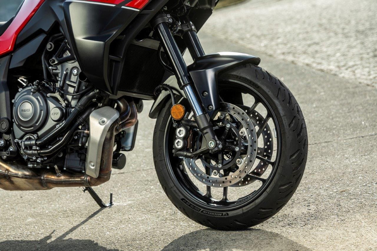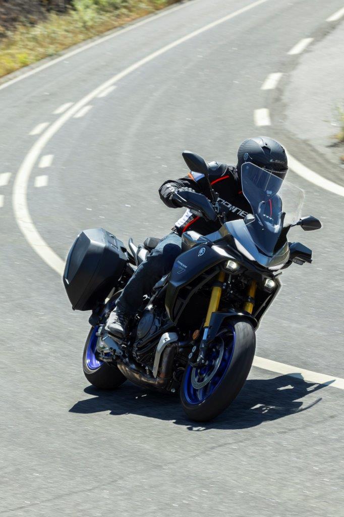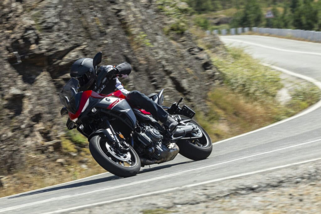 Het vermogen van de kleine Tracer 7 was kortom nog nooit zo gemakkelijk ‘in gebruik’, en heel eerlijk: heel veel meer dan die goede 73 pk vermogen en 68 Nm koppel heb je in een omgeving als deze eigenlijk ook helemaal niet nodig. Dat komt voor een deel ook op het conto van de enorm speelse stuureigenschappen van de Yamaha. Zowel de standaard uitvoering als de GT-versie zijn met respectievelijk 203 kg en 212 kg (zonder zijkoffers) 5 kg en 10 kg zwaarder dan voorheen, maar dat heeft geen negatieve uitwerking op de wendbaarheid van beide modellen. Ze sturen nog net zo speels en voorspelbaar als voorheen en missen iedere zweem van nervositeit. De standaard gemonteerde Michelin Pilot Road 6 GT banden om de nu iets zwaardere gietwielen (niet de ‘spin forged’ wielen van de MT-07) bieden bovendien uitstekend grip en geven kraakheldere feedback.