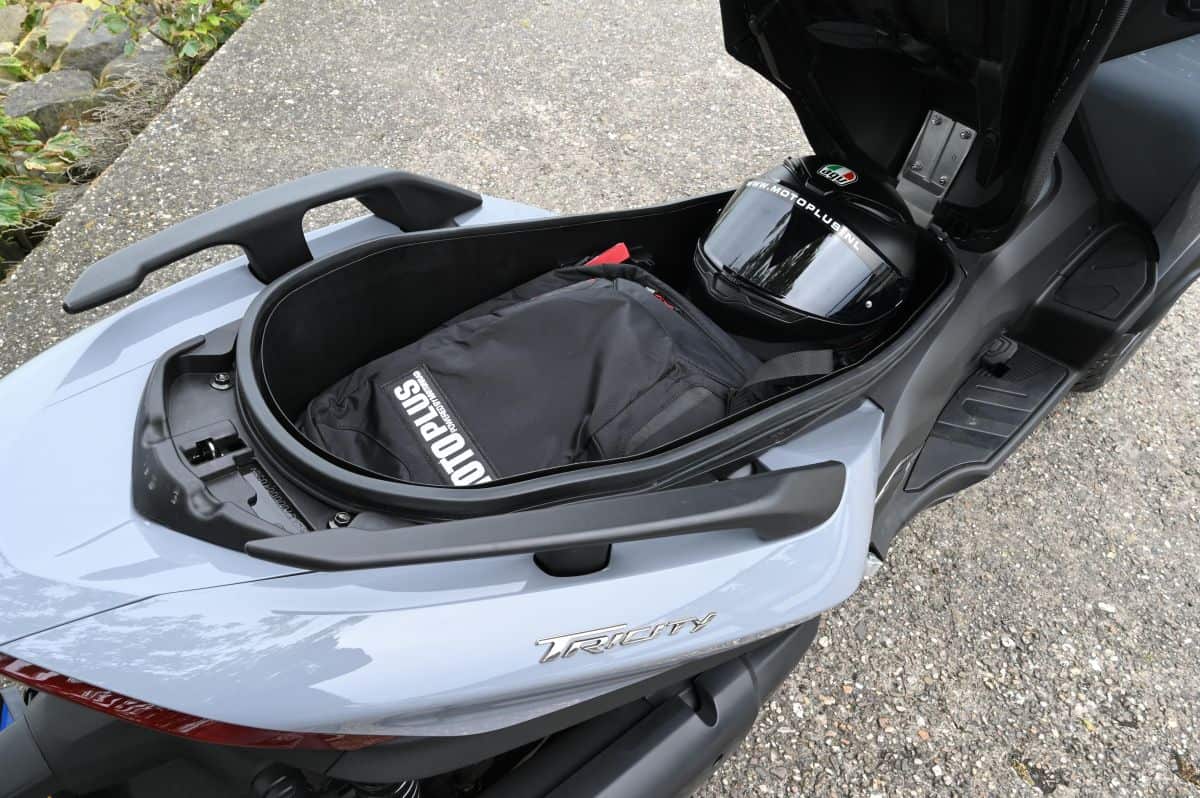De nieuwe motorscooter van Yamaha mag dan door zijn volumineuze voorkant 60 kilo zwaarder zijn dan de XMAX 300 uit eigen huis, daar is tijdens het rijden op deze wegen weinig van te merken. Dat ligt anders bij het oprijden van de snelweg. Bij een snelheid van boven de 100 km/ uur merk je dat de voorkant meer wind pakt dan een ‘conventionele’ motorscooter. Niet hinderlijk, en het zorgt ook niet voor een verminderde rijbeleving. Maar het is wel aanwezig. Qua aankleding heeft Yamaha er overigens voor gekozen de motorscooter lekker basic te houden. Naast het al eerder genoemde keyless-systeem beschikt de Tricity namelijk over een gecombineerd remsysteem, ABS, tractiecontrole en rondom LED-verlichting. Connectiviteits-opties zijn niet aan boord en ook heeft Yamaha voor een eenvoudig LCD-scherm gekozen. Is dat een gemis? Niet als je kijkt waarvoor de Tricity 300 bedoeld is. Yamaha heeft de motorscooter namelijk ontwikkeld als een degelijke woon-werkmachine die ongeacht het weer zijn kunstje moet kunnen doen. In dat opzicht maakt extra elektronica hem alleen maar extra kwetsbaar. Verder beschikt de Tricity 300 over alle gemakken die je van een motorscooter mag verwachten. Denk daarbij aan een meer dan capabele windbescherming, een 43,5 liter groot en keyless vergrendelbaar opbergvak waar twee integraalhelmen in passen en een bijzonder laag verbruik. Klein puntje van kritiek: het zadel zit heerlijk maar is aan de voorzijde wat breed waardoor kleinere rijders iets meer moeite moeten doen om met de voeten aan de grond te komen.