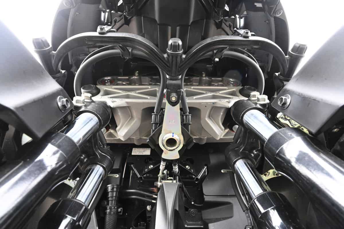 Dat Yamaha zich nu op automobilisten richt, is overigens even bijzonder als het opvallend lege Amsterdam. De Tricity 300 mag dan de derde ‘Leaning Multi Wheel’ (LMW) van het merk zijn, dit is pas de eerste die ook geschikt is om met een B-rijbewijs te besturen. De truc daarbij zit hem uiteraard in de dubbele voorwielen met een spoorbreedte van meer dan 46 cm en de aanwezigheid van een handen voetrem. Door hieraan te conformeren, breekt Yamaha met haar eerdere insteek. De twee andere LMW’s van Yamaha – de Tricity 125 en de Niken – hadden namelijk bewust een smallere spoorbreedte dan 46 cm. Zeker met de Niken mikte Yamaha specifiek op motorrijders, met een futuristisch ogende driewieler die zich vooral in de kijker speelde met een zeer bijzondere voorwielophanging. Waarom? Omdat het LMW-principe in de ogen van Yamaha het ultieme antwoord was in de zoektocht naar meer voorwielgrip, meer stabiliteit en uiteindelijk ook meer lol, zonder daarbij concessies te doen aan datgene wat motorrijden zo’n heerlijk verslavende bezigheid maakt: het rijden van hellingshoeken. Of het merk daarmee de juiste strategische keuze heeft gemaakt, lijkt een twistpunt. Met de Tricity 300 wordt de focus op motorrijders losgelaten, en mikken de Japanners ook op mensen die alleen over een B-rijbewijs beschikken. En daar heeft het merk een heel capabele machine voor samengesteld. Net als de andere LMW’s is de grootste glansrol daarbij weggelegd voor de volledig mechanisch werkende voorpartij met dubbele vorkpoten en stuurgeometrie. Een uitkristallisering van jarenlang onderzoeken en proberen.