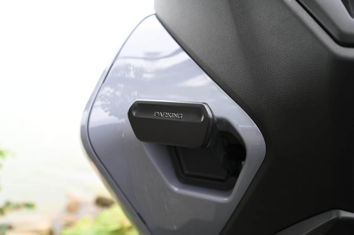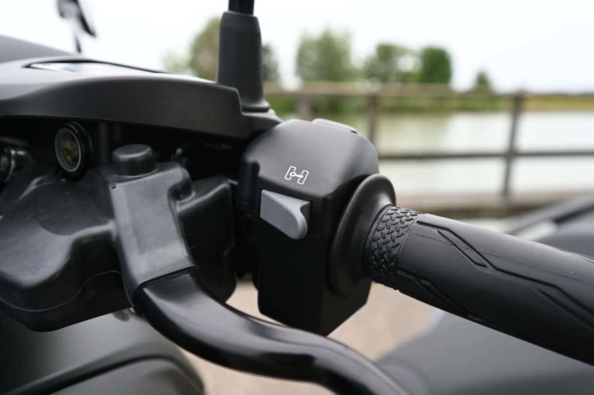In tegenstelling tot dat systeem blijft het op de 300 namelijk mogelijk om iets heen en weer te bewegen (zie foto’s hieronder). Hierdoor kun je, ook als de assistent is ingeschakeld, toch nog kleine correcties uitvoeren als je voelt dat de motor een kant op dreigt te hellen. Het inschakelen van deze ‘ sta-assistent’ gaat via de knop waar normaliter de seinknop van het grootlicht zit en wordt bij activatie voor de duidelijkheid vergezeld door een duidelijk hoorbare piep. Maar alleen als de motor minder dan 2.000 toeren draait en de Tricity langzamer dan 10 kilometer per uur rijdt. Daarboven kun je drukken tot je een ons weegt, maar gebeurt er niks. Als deze eenmaal ingeschakeld is, wordt de assistent automatisch uitgeschakeld als je de gestelde limiet passeert. In de basis werkt dit zeer goed, maar omdat er ook altijd wat beweging mogelijk blijft zit er ook een nadeel aan. Zeker als je niet helemaal horizontaal voor het stoplicht tot stilstand bent gekomen. Dan heeft de scooter namelijk de neiging nog iets verder door te zakken, waardoor je – zeker bij het wegrijden vanuit die positie – als vanzelf de neiging hebt een voet aan de grond te zetten. Daarmee gaat de standing assist eigenlijk voorbij aan zijn doel en heeft het meer weg van een leuke gimmick dan dat het echt een grote praktische verbetering is.