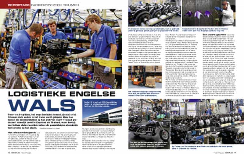 Twee- en driepitters, het moge inmiddels bekend zijn dat er bij Triumph niets anders in het frame wordt gelepeld. Maar hoe komt die karakterblokken op hun plek? En waar? Triumph produceert namelijk zowel in Engeland als Thailand, maar dankzij een feilloos stukje logistiek vallen alle puzzelstukjes uiteindelijk toch precies op hun plaats. Het allesvernietigende vuur herinnert Guy Campton zich nog al de dag van gisteren. “Ik had net een dag vrij, toen het gebeurde”, vertelt de man die bij de salarisadministratie ook wel bekend staat als medewerker nummer 16. Het werknemersaantal staat tegenwoordig op een kleine 900, maar Campton is er één van het allereerste uur. Hij stond aan de wieg van Triumph’s wedergeboorte, was erbij toen een klein team, komend vanuit een in het geheim gehuurd kantoorpand, zijn intrek nam in de nieuwbouw aan de rand van het Engelse Hinckley. Dat is inmiddels alweer een kleine twintig jaar geleden. En bijna tien jaar zijn er voorbij gegaan sinds de beruchte brand. Op de avond van 15 mei 2002 maakten de verwoestende vlammen Factory One met de grond gelijk. Triumph’s eerste productiehal in de ‘Hinckley-periode’ werd die nacht nagenoeg volledig in de as gelegd, enkel de spuiterij, die zich nog altijd op diezelfde plek bevindt, overleefde het alles verslindende vuur nagenoeg onbeschadigd. De maanden daarop werden voor Guy Campton de meest enerverende en tegelijkertijd vermoeiendste in Triumph dienstverband: in een zo kort mogelijk tijdsbestek moesten de productie-ingenieurs een nieuwe productielijn uit de grond stampen in de drie jaar daarvoor geopende Factory Two.