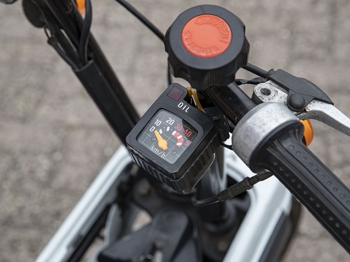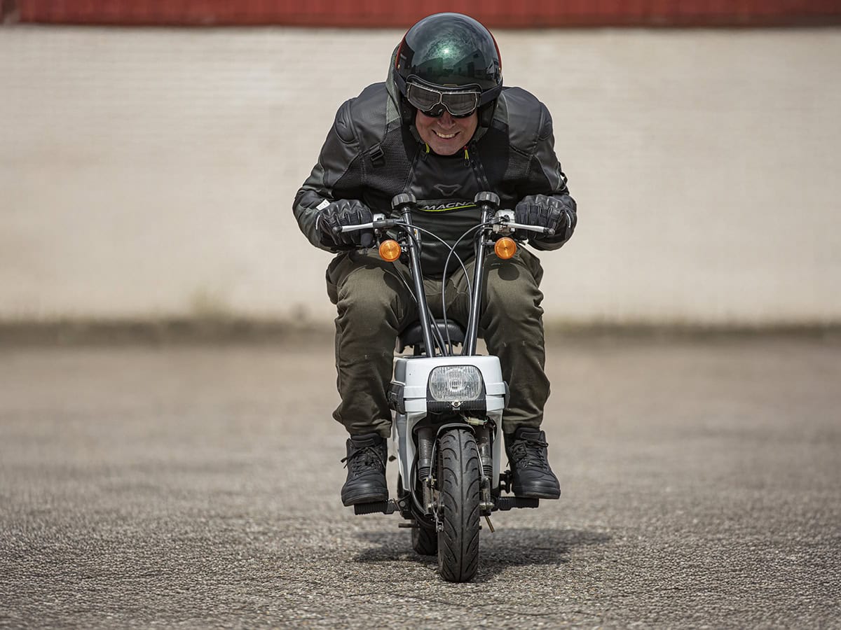 Vandaag staat de kortste testrit ooit op het programma. Omdat de Motocompo nog niet officieel is ingevoerd, is het niet slim om de openbare weg op te duiken. Het is überhaupt de vraag of dat slim is. De Honda is namelijk nogal traag, bijzonder traag zelfs. Met wat ferm meepoten komt het ding uit stilstand nog wel op gang, maar elke elektrische fiets haalt je in. Is zo’n ‘last mile’ toch nog een hele marathon. En toch…. Toch kan dertig km/uur nog doodeng aanvoelen. De remmetjes doen me direct terugdenken aan de velgremmen van mijn oude Burco in de regen. En mocht je de vorige avond bruinebonensoep hebben gegeten dan schuif je na een knetterende scheet zo maar twee banen naar links op. De vering veert zowaar comfortabel over de paar millimeter beschikbare veerweg, maar heeft dan weer een broertje dood aan demping. Het voelt best beangstigend en toch lach ik me helemaal suf. Hoe briljant is het dat je ergens op een Utrechts industriegebied op zo’n unieke Honda/tweewieler mag rijden? Het ding is al meer dan veertig jaar oud en toch nog altijd revolutionair. Dat is toch magnifiek! Als ik van dit 2,5 pk sterke ‘kanon’ afstap giert er meer adrenaline door mijn lijf dan na een rit op zoveelste 150 pk+ motorfiets. Of verwar ik adrenaline hier met endorfine, het stofje dat vrijkomt bij lachen?