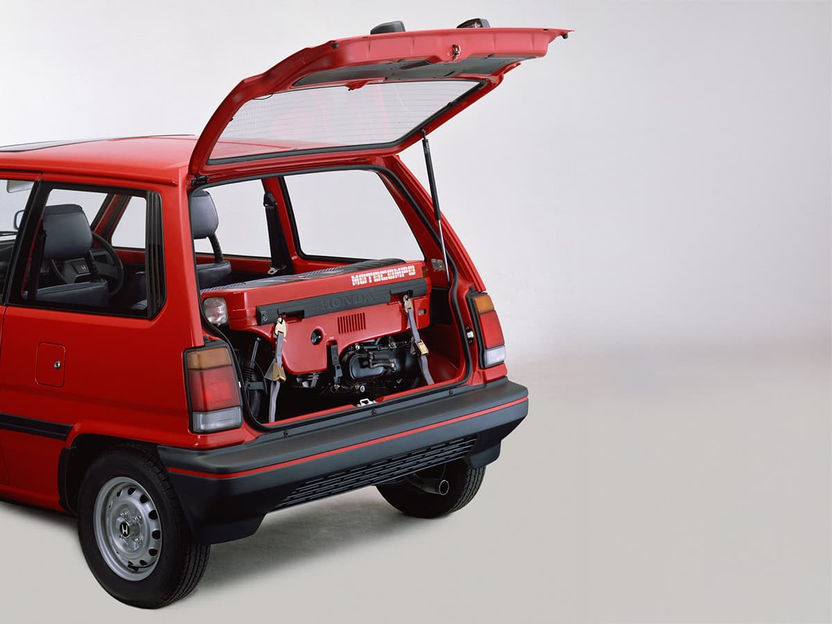 Er zijn in de geschiedenis meer zeswielers geweest. Succesvolle zelfs. De onvergetelijke Tyrrell P34 won in het ELF-blauw en in handen van Jody Scheckter bijvoorbeeld de 1976 Formule 1 Grand Prix van Zweden. Over dat soort zeswielers gaat dit verhaal dus niet. Dit gaat over de optelsom van twee (Motocompo) en vier (Jazz) wielen. Waarom we het voor het gemak dan toch over een zeswieler hebben? Omdat de twee nadrukkelijk naast elkaar ontwikkeld zijn als een onlosmakelijke twee-eenheid. Honda dacht met dit gemotoriseerde setje de ideale oplossing in handen te hebben voor forenzen. Die zouden met de auto tot de stadsgrens rijden, hun wagen daar parkeren en dan de laatste kilometers door de verstopte binnensteden op hun miniscooter afleggen. De Jazz – die overigens ook bekend staat als City – is daarbij de vierwieler en de Motocompo de tweewieler. In de bagagebak van de Jazz zit daarom een uitsparing waarin de miniscooter perfect past.
