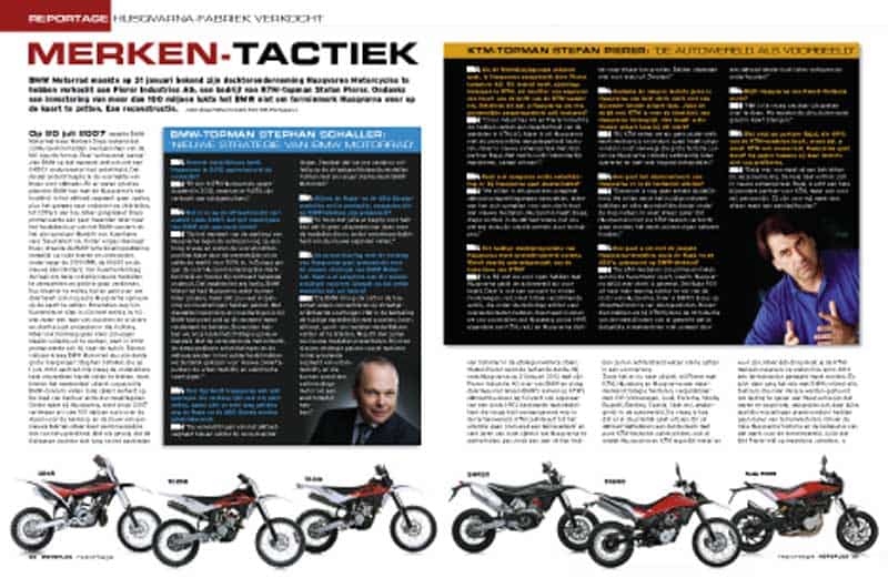 BMW Motorrad maakte op 31 januari bekend hun dochteronderneming Husqvarna Motorcycles te hebben verkocht aan Pierer Industries AG, een bedrijf van KTM-topman Stefan Pierer. Ondanks een investering van meer dan 100 miljoen lukte het BMW niet om terreinmerk Husqvarna weer op de kaart te zetten. Een reconstructie. Tekst: Michael Pfeiffer, Eric Bulsink Foto’s BMW, KTM, Husqvarna Op 20 juli 2007 maakte BMW Motorrad-baas Herbert Diess bekent dat zij Husqvarna hadden overgenomen van de MV Agusta-group. Zeer verrassend, aangezien BMW op dat moment zelf ook net een G450X enduromotor had ontwikkeld. Dat model onderstreepte al de voorliefde voor offroads van Diess. En er waren grootste plannen: BMW kon met de Husqvarna’s een hoofdrol in het offroad-segment gaan spelen, plus het gamma naar onderen toe uitbreiden, tot 125-ers aan toe. Maar gangmaker Diess promoveerde een paar maand later naar het hoofdbestuur van het BMW-concern en liet zijn opvolger Hendrik von Kuenheim vele ‘baustellen’ na. Onder volgas-manager Diess draaide de BMW-ontwikkelingsafdeling namelijk op volle toeren en ontstonden onder meer de S1000RR, de K1600 en de nieuwe ééncilinders; Von Kuenheim kreeg de taak om deze volledig nieuwe modellen te vermarkten en geld te gaan verdienen. Dus bleef er te weinig tijd en geld over om daarnaast ook nog eens Husqvarna opnieuw op de kaart te zetten. Bovendien zag Von Kuenheim er diep in zijn hart weinig in; hij was meer een man van scooters en cruisers en startte juist projecten in die richting.