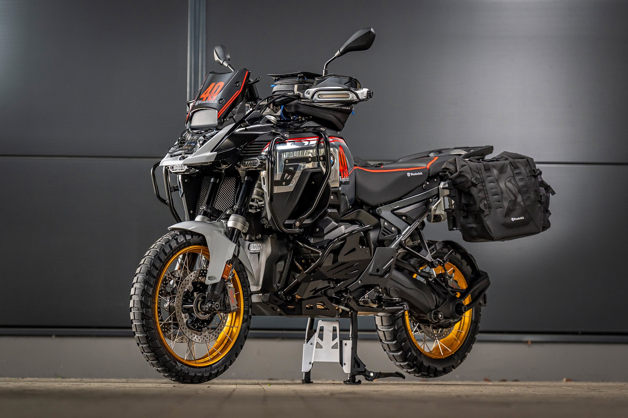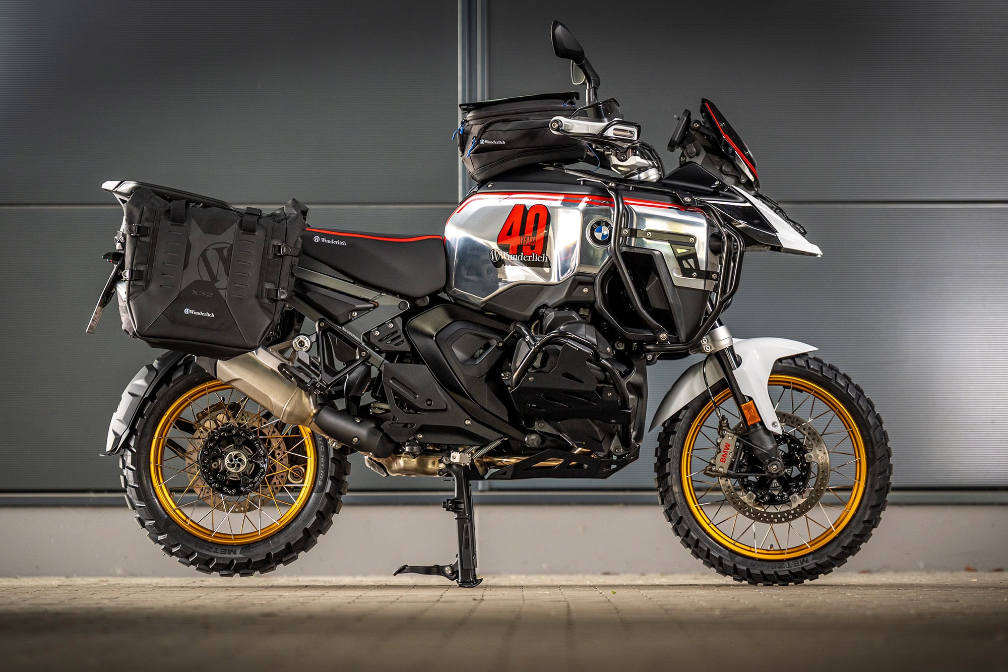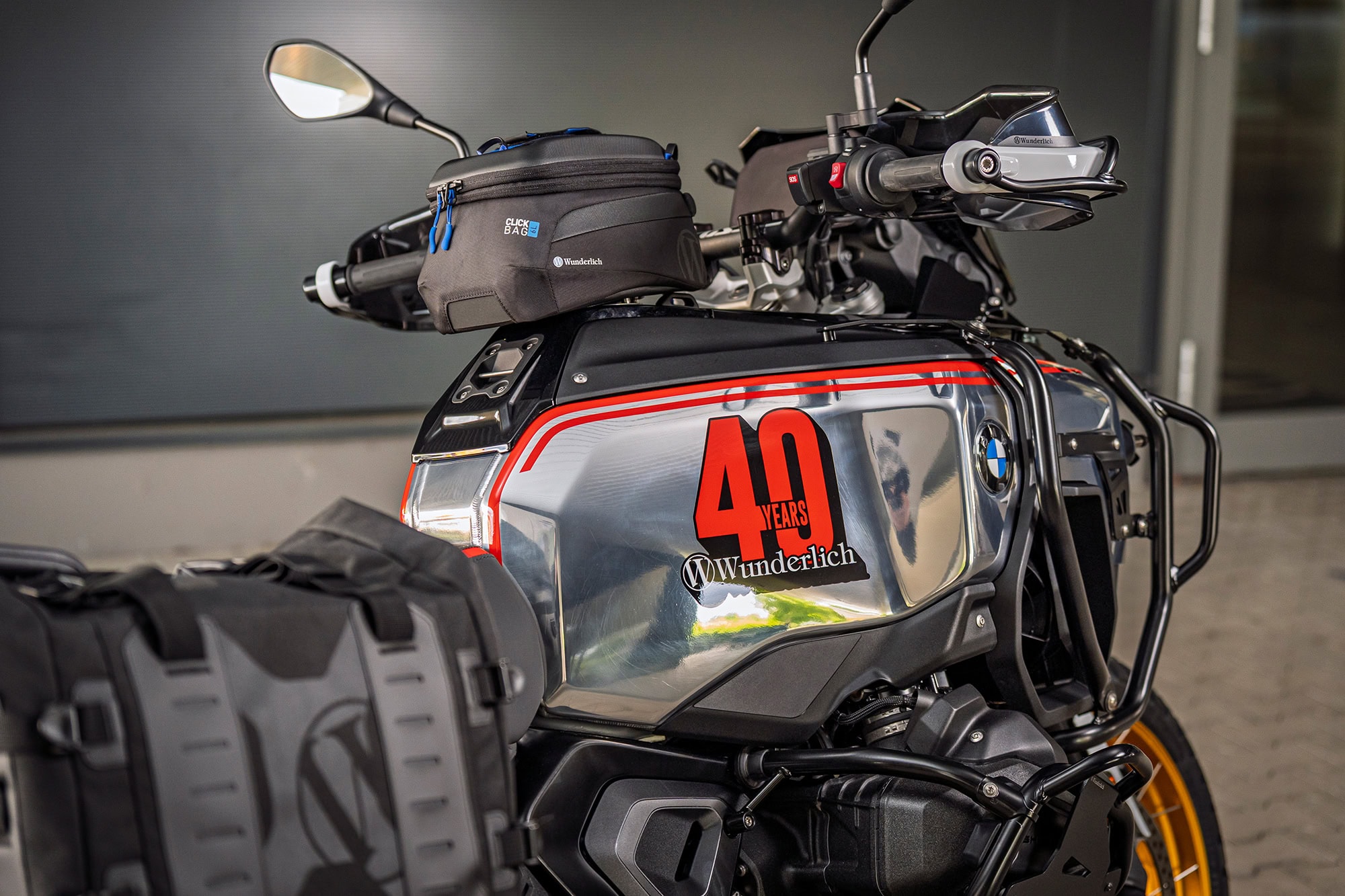 Als student kocht Wunderlich ooit een XT, maar bevlogen van techniek als hij toen al was, paste hij de Yamaha naar eigen wens aan. Zijn speciale kit voor het optimaliseren van de nokkenaskettingsmering van de XT was in feite de geboorte van het bedrijf Wunderlich. En dat brengt ons weer veertig jaar verder in de tijd en wel bij ‘The Tribute’, een door Wunderlich onder handen genomen BMW R1300GS Adventure, die zowel een eerbetoon is aan die XT van veertig jaar terug als aan 40 jaar Wunderlich. Links en rechts voorzien van spulletjes uit de eigen schappen valt deze creatie natuurlijk vooral op door de aluminiumkleurige benzinetank als mooie verwijzing naar de eerste en meest begerenswaardige XT500, de 1N5 uit 1976. Inderdaad met die fraaie gepolijste aluminium tank.