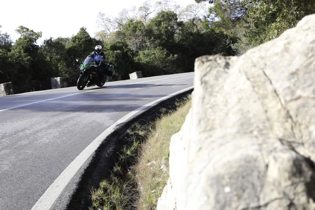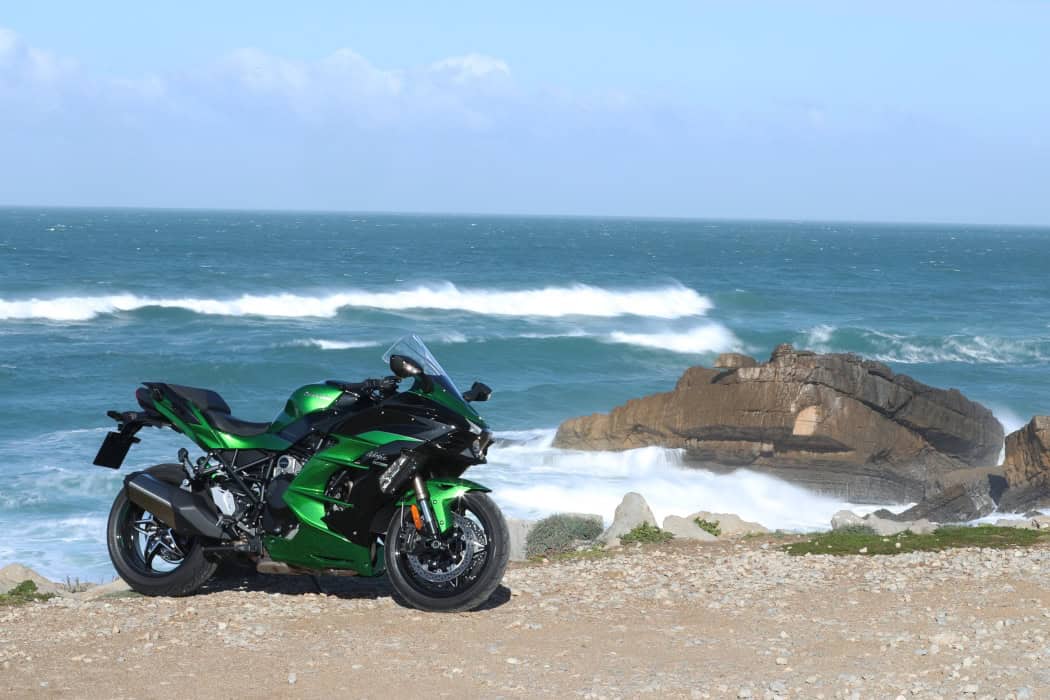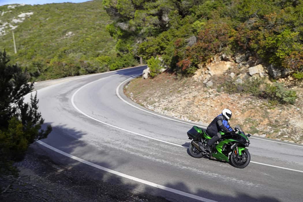 Gelukkig komt een dag later de herkansing, die met beide handen wordt aangegrepen. Er staat een handling-test op het circuit van Estoril op het programma, maar al op de weg erheen maakt het betere hallelujagevoel zich meester van me. Lange, snelle bochten, goed asfalt; een betere habitat voor de H2 SX kun je je niet wensen. De redelijke sportieve, maar nog altijd comfortabele zitpositie bijvoorbeeld, betaalt zich hier helemaal uit. Onder meer omdat er wat minder druk op de polsen rust door de hogere snelheid. Stabiel als lopend op rails rond ‘ie de snelle doorlopers, maar ook met wat krappere bochten weet de viercilinder zich prima raad, wat deels toe te schrijven zou kunnen zijn aan het feit dat de koffers in het hotel zijn achtergebleven.
