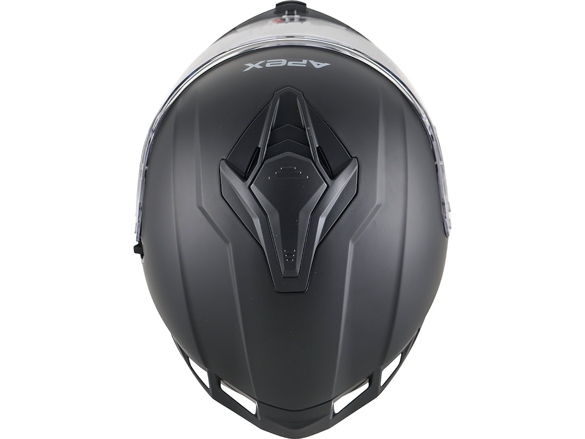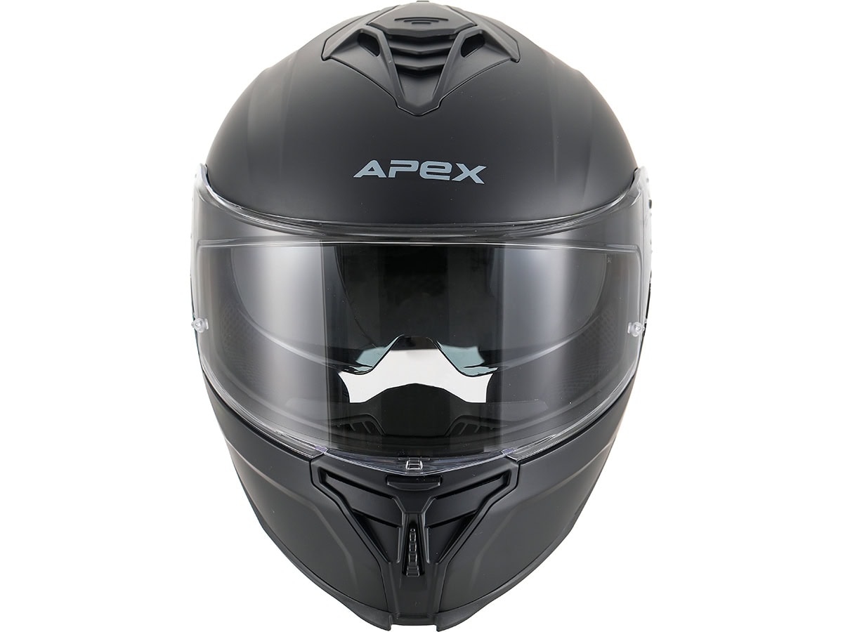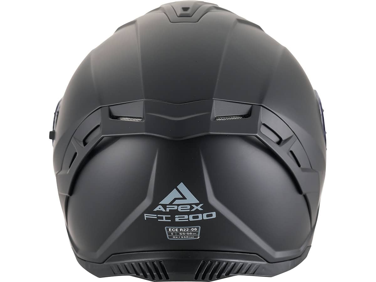 De lekker scherp gelijnde sportieve toerhelm (uiteraard gehomologeerd volgens de meest actuele 22.06-norm) is opgebouwd rond een stevige polycarbonaat buitenschaal (in twee maten) en herbergt tal van praktische eigenschappen. Meerdere openingen op voor- en achterzijde zorgen voor een aangename ventilatie op warme dagen, de binnenvoering is uitneem- en wasbaar en de quick-release wangkussens zullen vooral bij de hulpdiensten in goede aarde vallen, mocht daartoe onverhoopt de noodzaak zijn. Verder is de Apex FI200 standaard voorzien van een geïntegreerd zonnevizier, micro-metrische snelsluiting, snelwisselmechanisme van het vizier en subtiele uitsparingen voor brildragers.