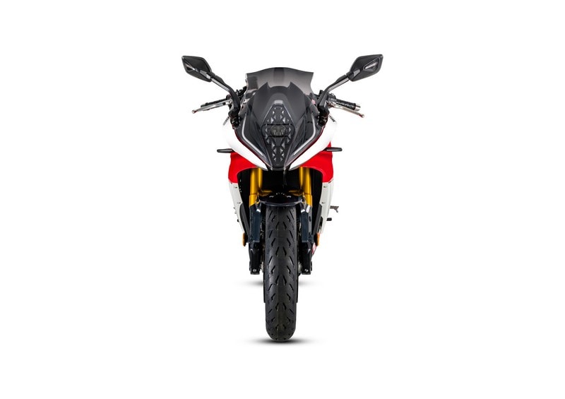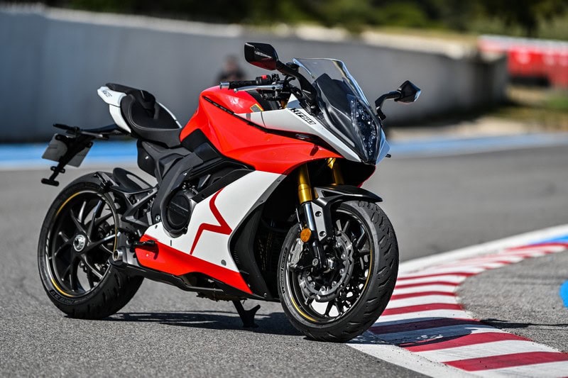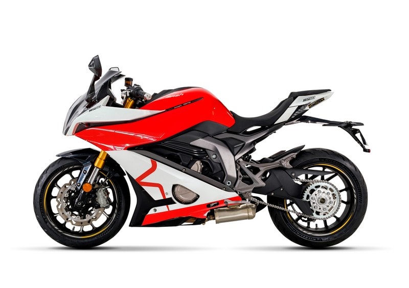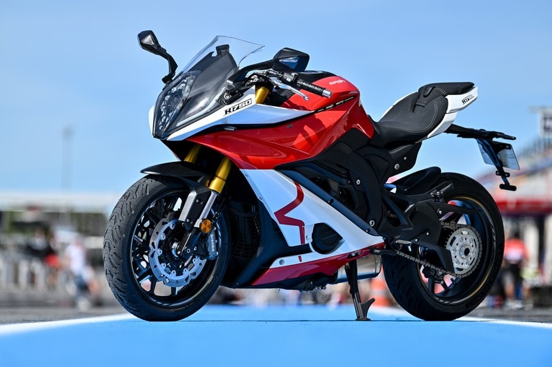 Beter zichtbaar dan het blok is het rijwielgedeelte dat bestaat uit een aluminium dubbel wiegframe, een upside down-vork en monoshockdemper. Het is nog niet precies duidelijk in hoeverre voor- en achterkant instelbaar zijn. Bij de remmen zien we altijd weer die ene partij opduiken: Brembo. Met een rijklaar gewicht van 206 kilo en een redelijk compacte wielbasis van 1.464 millimeter moet gewillig sturen niet zo’n probleem zijn.