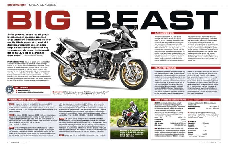Toen de naakte CB1300 (modelcode SC40) in 1998 in Japan verscheen had die nog koelribben en carburateurs. Vijf jaar later zijn die allemaal verdwenen en gaat de machine (SC54) met injectie, katalysator en secundair luchtsysteem door het leven. In 2005 kunnen we in de Lage Landen voor het eerst de S met zijn tophalf kopen. Voor € 550,- kreeg je er ook nog ABS bij. Gelukkig hechtte de eerste eigenaar van deze occasion daar al zoveel waarde aan dat het op de machine zit. Verder voelde hij gelukkig niet veel behoefte om iets te wijzigen aan de machine. Die heeft daarom alleen nog een ruggensteun voor de passagier, die ik er persoonlijk direct vanaf zou sleutelen en hetzelfde geldt voor het bagagerekje. Het is een lot dat de ruig ogende stereoschokdempers van Hyperpro absoluut bespaard blijft.