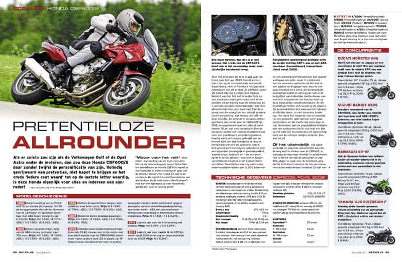 Deze 600’s duiken zo nu en dan als ‘re-import’ met nieuwe papieren uit Polen of Italië weer op internet op. Los daarvan is er een aantal PC38-modellen geweest dat last had van roestvorming in de benzinetank, maar ook na de garantieperiode is Honda geneigd om coulant met dit soort problemen om te gaan. Er zijn in ieder geval drie terugroepacties voor de CBF600 geweest: PC38, modeljaar 2006 (brandstofkraan), PC43, modeljaar 2008 (toerenteller) en PC43, modeljaar 2008/2009 (bevestigingsbouten achterste hoofdremcilinder). MODELGESCHIEDENIS2004Introductie van de PC38.2006Knipperlichten met helder glas, langere spiegelsteunen.2008Nieuw model (PC43) met benzine-injectie, aluminium frame (was staal), grotere benzinetank (20 in plaats van 19 liter), nieuwe veerelementen, nieuw zadel, gewijzigde cockpit, langere swingarm, kortere overbrenging, startonderbreker, integraal remsysteem (ABS-versie), nieuwe middenbok.TECHNISCHE GEGEVENS (CBF600S, PC43, modeljaar 2008)MOTOR vloeistofgekoelde viercilinder viertakt lijnmotor, dubbele bovenliggende ketting-aangedreven nokkenassen en vier kleppen per cilinder, wet-sump smering, benzine-injectie, geregelde katalysator, mechanisch bediende natte meerplaatskoppeling, zesversnellingsbak, O-ring-ketting.Boring x slag 67,0 x 42,5 mmCilinderinhoud 599 ccMax. vermogen 57 kW (78 pk) bij 10.500 tpmMax. koppel 59 Nm bij 8.250 tpmRIJWIELGEDEELTE aluminium ruggengraatframe, telescoopvoorvork, stalen swingarm met monoschokbreker, veervoorspanning verstelbaar, dubbele schijfrem voor, schijfrem achter, ABS optioneel.Aluminium gietwielen 3.50 x 17; 5.00 x 17Banden 120/70ZR17; 160/60ZR17MATEN EN GEWICHTEN wielbasis 1.490 mm, balhoofdhoek 64,0°, naloop 110 mm, veerweg v/a 120/125 mm, zithoogte* 770-800 mm, rijklaar gewicht volgetankt* 226 kg, max. belading* 191 kg, tankinhoud 20,0 liter. METINGENTopsnelheid** 213 km/uurAcceleratie0 – 100 km/uur 4,0 sec0 – 200 km/uur 21,1 secDoortrekken60 – 140 km/uur 11,3 secVerbruikSecundair 1 op 21,7Snelweg (130 km/uur) 1 op 18,5* MotoPlus-meting** FabrieksopgaveMARKTSITUATIEOp naar de merkvreemde dealer! Dat zou het motto kunnen zijn als je op zoek bent naar een gebruikte CBF600 en niet bij een particulier wilt kopen. Veel CBF600’s eindigen als beginners- of heropstappersmachine namelijk vaak bij een merkvreemde dealer (BMW, Triumph en Ducati) en de schuiven de Japanner bij voorkeur zo snel mogelijk door naar de uitverkoophoek. Het prijsverschil dat er bij nieuwverkoop zit tussen de naakte CBF en die met tophalf speelt op de occasionmarkt eigenlijk geen rol van betekenis meer.