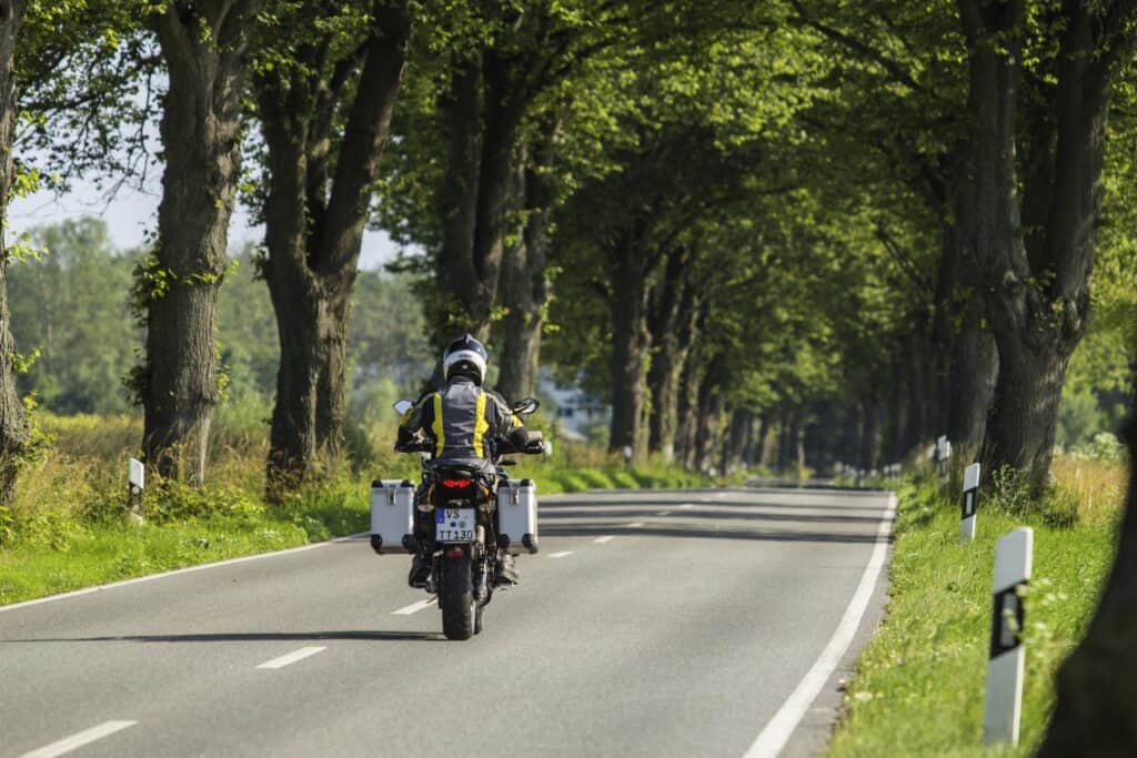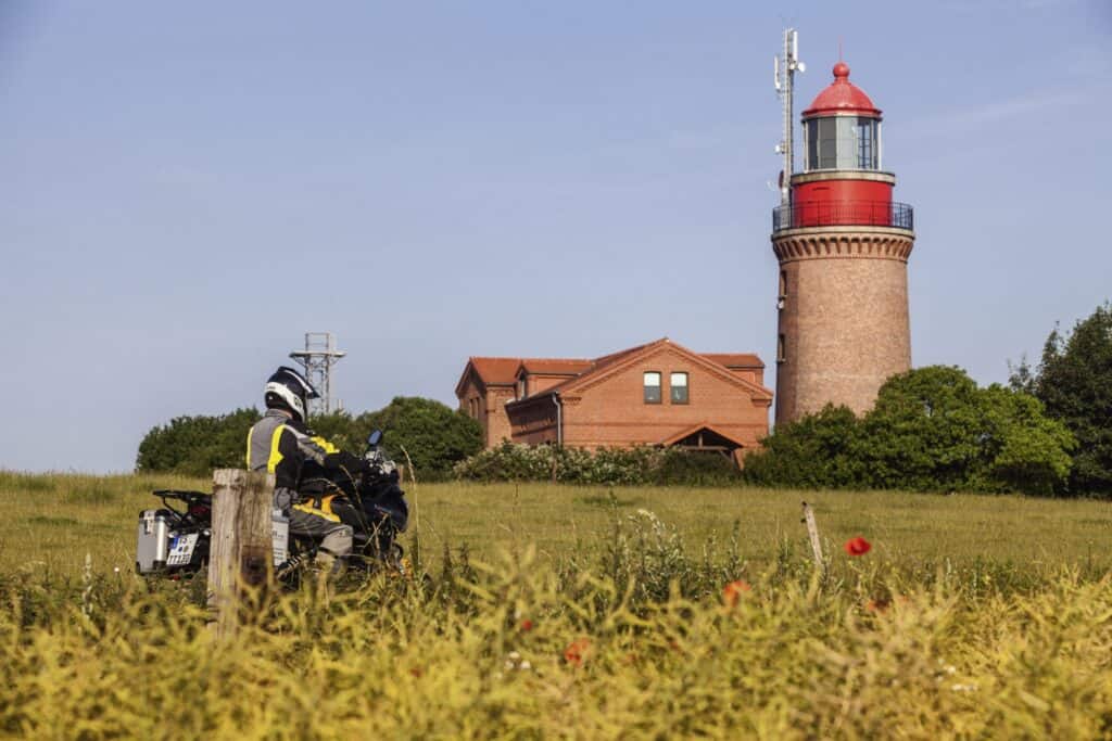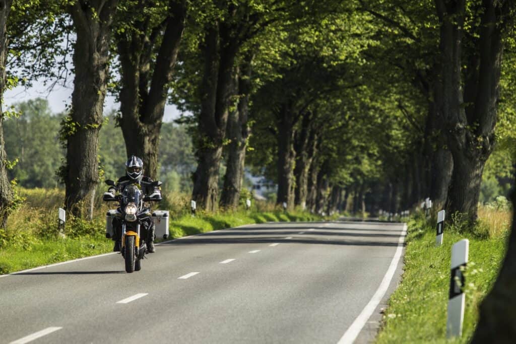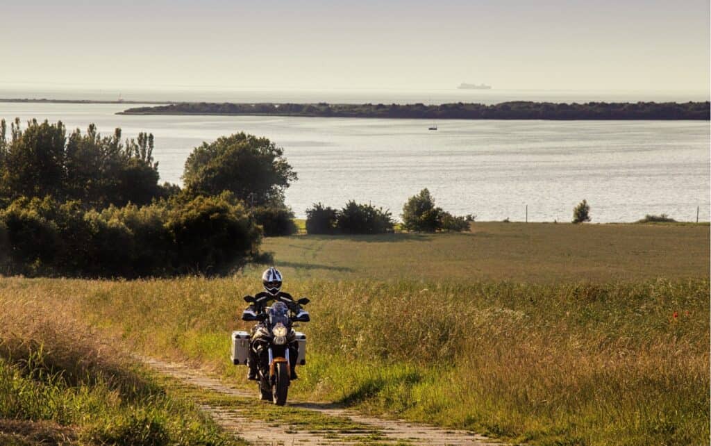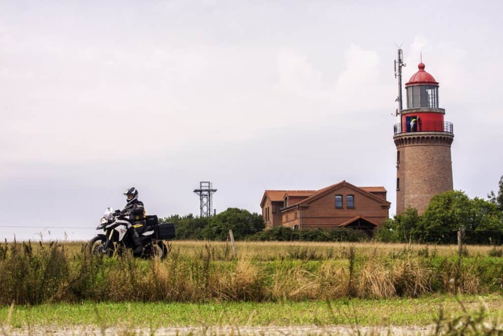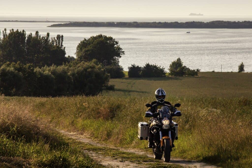 Het verkeersbord aan het einde van bebouwde kom van Greifswald vervaagt net op het moment dat de banden in de achteruitkijkspiegel een donkere streep trekken op het opdrogende wegdek. Snel wordt hij weer onzichtbaar en de overgebleven druppels op het vizier worden snel verjaagd door de rijwind. Het droogt snel, terug naar Rügen dan maar? Geen sprake van! De monsterwolk plakt nog steeds boven het eiland. Er is bovendien nog een ander eiland dat zeer de moeite waard is, Usedom. Daar is de hemel in elk geval al lichtgrijs gekleurd. Kun je je met een natte broek meer wensen dan een regendruppelvrije rijwind?