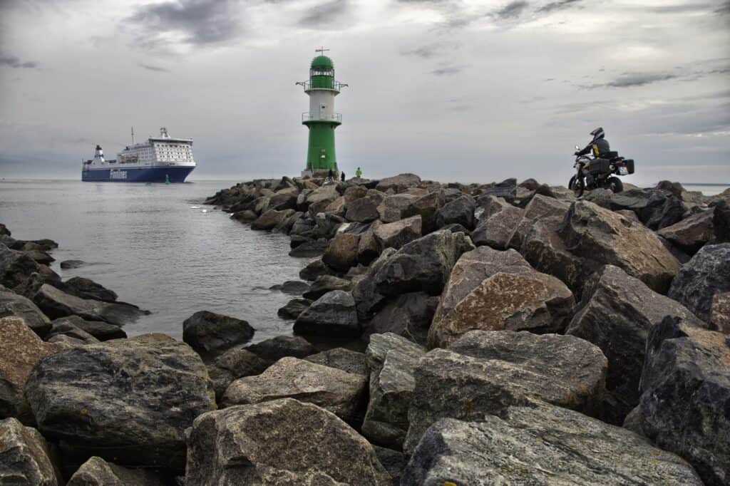 Ik ben vandaag extra vroeg mijn bed uitgekomen om de verloren tijd van gisteren weer goed te maken. Nog voor het ontbijt rijd ik naar de pier van Warnemünde. Net op tijd om de binnenvarende Finnlady uit Helsinki te zien. Alleen aan de kade kom je nog dichter bij de grote schepen. Ik zou nu wel een kop koffie lusten en dan schieten mij opeens de woorden van mijn vriend John-Paul te binnen: “Je moet in ieder geval naar de vuurtoren van Bastorf!” “Waarom?” “Vanwege het duindoornijs.” Maar dat is weer terug richting Rerik! Mijn innerlijke stem begint zich ermee te bemoeien: “Nou en? Koffie kun je daar ook krijgen en gisteren ben je er gewoon achteloos langs gereden.” Jaja, komt goed.