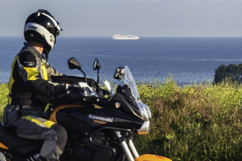 Vlinderachtige klaprozen sieren de rand van de weg. Vizier open, rustig tempo en diep ademhalen. Het duindoornijsje heeft aromasporen achtergelaten in mijn mondhoeken. Aan de horizon zie ik een witte Scandinavische veerpont voorbijschuiven. Waarom heb ik me gisteren eigenlijk zo gehaast? Telkens weer moet ik van de weg af, de hard geworden berm in. De weg is te smal voor twee auto’s of een auto en een motorfiets om elkaar te passeren. De mensen hier zijn het gewend, alleen vreemden vertrekken hun gezicht als ze met hun SUV of motorfiets over een tweederangs ondergrond moeten rijden.