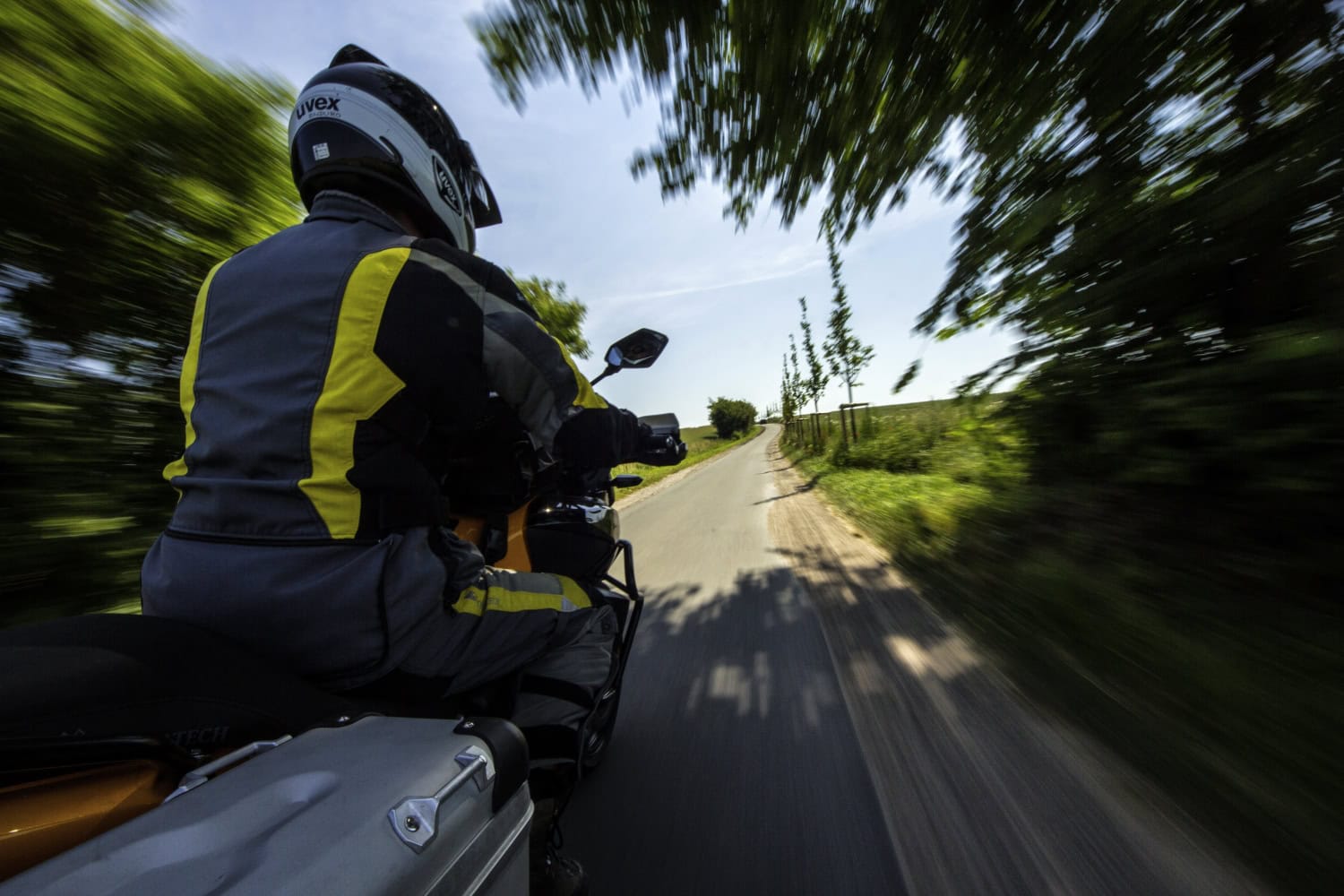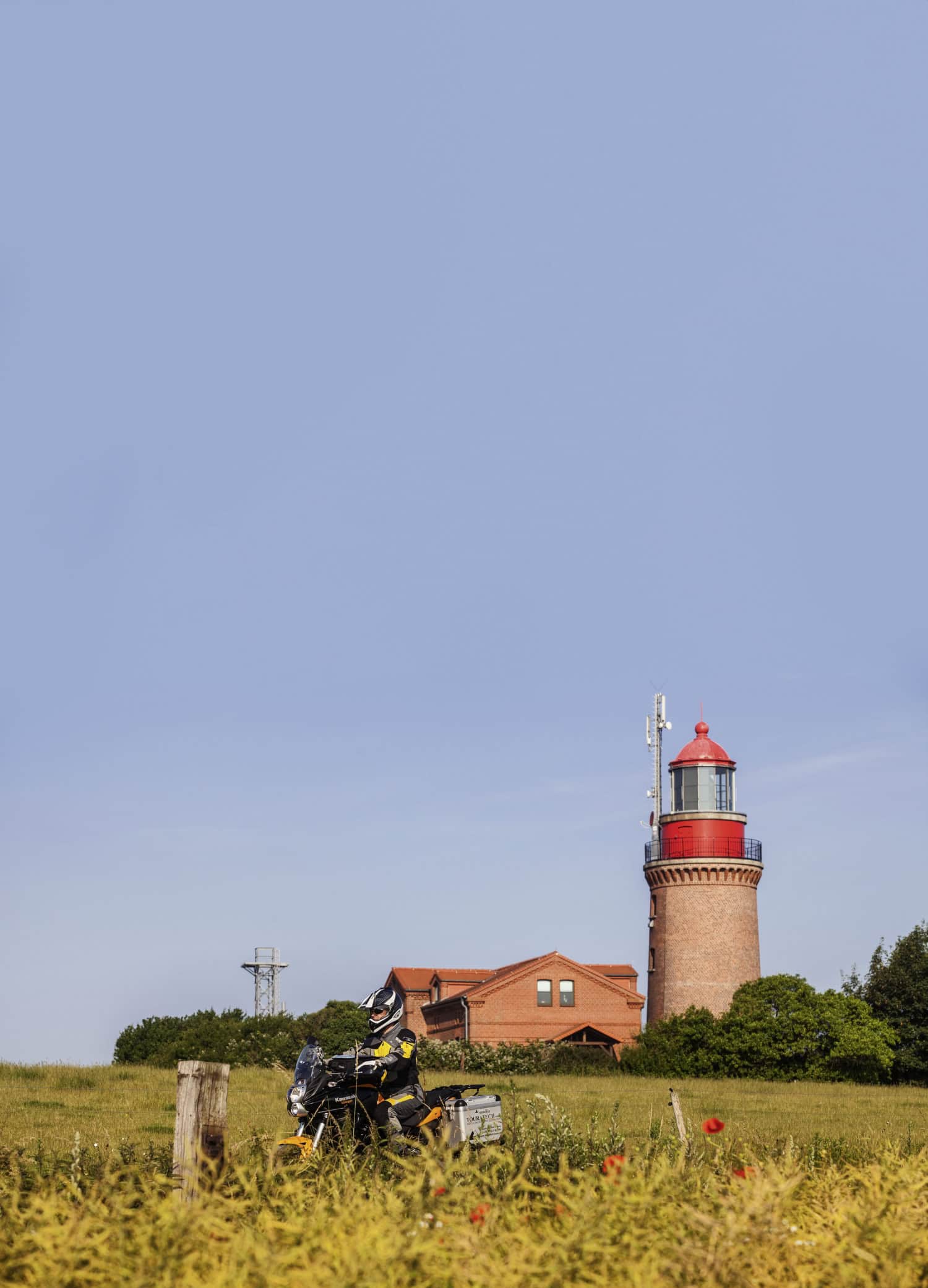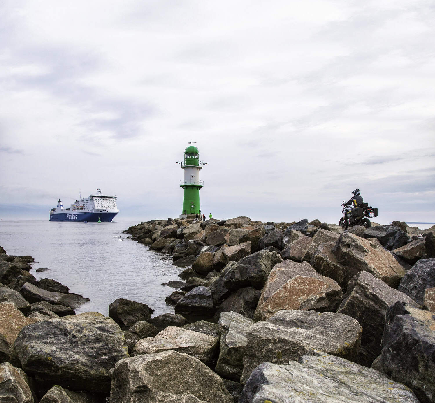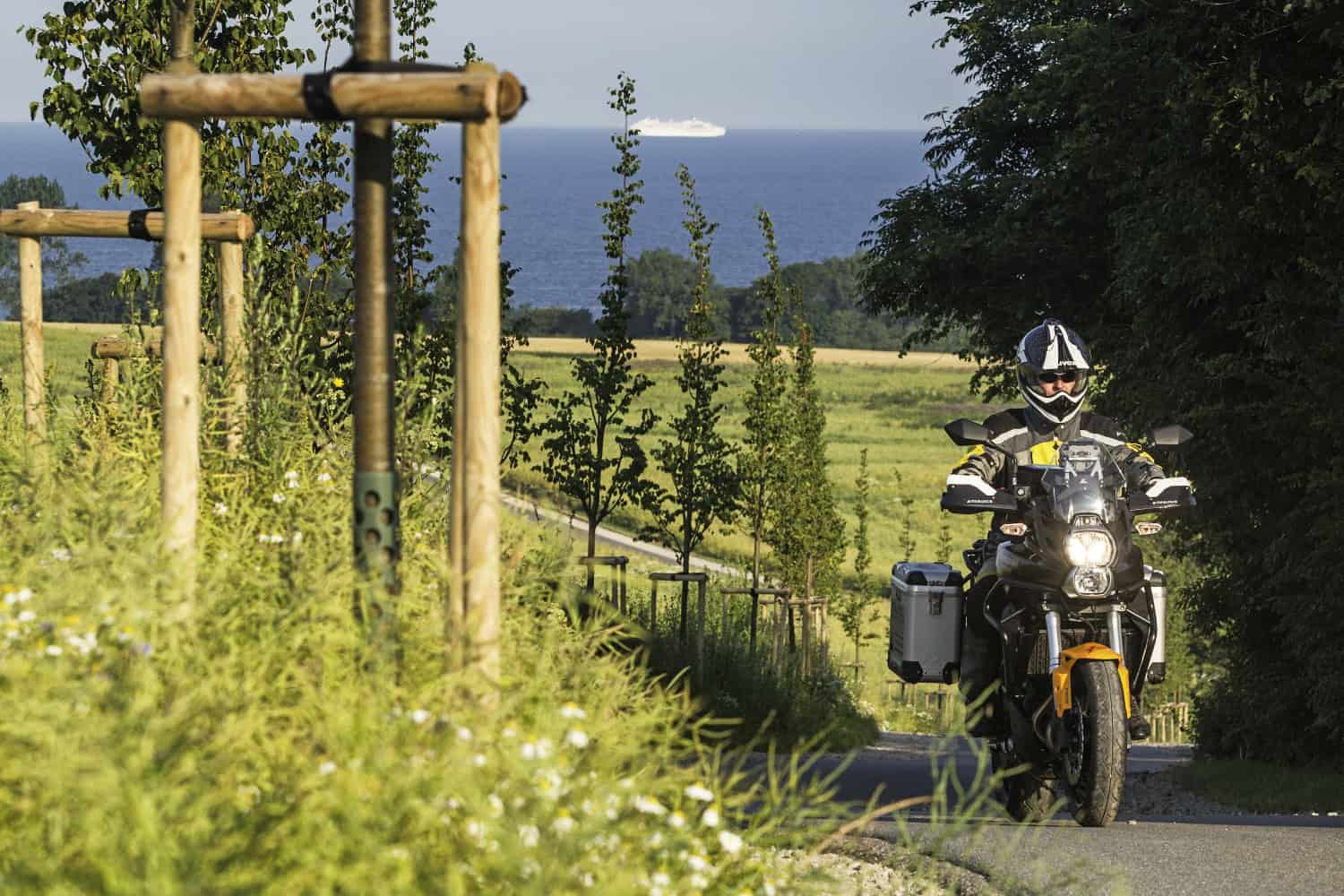 Het verkeersbord aan het einde van bebouwde kom van Greifswald vervaagt net op het moment dat de banden in de achteruitkijkspiegel een donkere streep trekken op het opdrogende wegdek. Snel wordt hij weer onzichtbaar en de overgebleven druppels op het vizier worden snel verjaagd door de rijwind. Het droogt snel, terug naar Rügen dan maar? Geen sprake van! De monsterwolk plakt nog steeds boven het eiland. Er is bovendien nog een ander eiland dat zeer de moeite waard is, Usedom. Daar is de hemel in elk geval al lichtgrijs gekleurd. Kun je je met een natte broek meer wensen dan een regendruppelvrije rijwind?