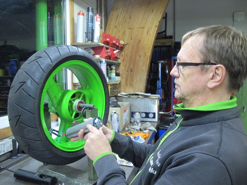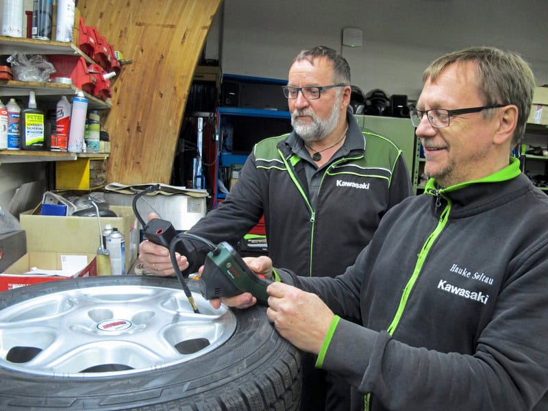En dat zijn niet de minste. We zetten de Airman Airgun, Bosch Easypump, Brüder Mannesmann XC-1 Pro Serie 12V, Cycplus Air Inflator, Xiaomi Mi Portable Electric air Compressor en Technax TX-157 tegenover elkaar. Maar dan de vraag hóé de draagbare compressors getest worden. Er zijn in totaal zoals altijd weer 100 punten te verdelen op het gebied van uitrusting, bediening, pompprestatie, afwerking, afmeting en gewicht en prijs-kwaliteitverhouding. Voor de pompprestaties werden de compressoren eerst volledig opgeladen, waarna ze eerst een motorband (190/50ZR17 Kawasaki achterband) volledig moesten oppompen van 0 naar 2,9 bar. Aansluitend werd de accu weer volledig opgeladen en was het de beurt aan een autoband (205/65R15), die van 0 op een spanning van 2,2 bar moest worden gebracht. Een compleet gevulde band levert tien punten op, wanneer dan vervolgens zonder bijladen nog een band volledig kan worden opgepompt, levert dat vijf extra punten op. Per band zijn er dus vijftien punten te verdien. De resterende vijf ‘bonuspunten’ waren te verdienen met de benodigde tijd. Apparaten die de eerste keer niet de band volledig wisten te vullen, kregen na bijladen een tweede kans. De beste van twee pogingen werd beoordeeld. Bij het laden hielden we ons aan de door de fabrikant voorgeschreven maximale laad – tijden en/of afkoelfases. Ook keken we bijvoorbeeld naar hoe accuraat de interne spanningsmeters waren door met een geijkte manometer de exacte spanning van de auto- en motorband na te meten.