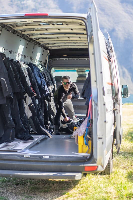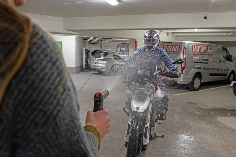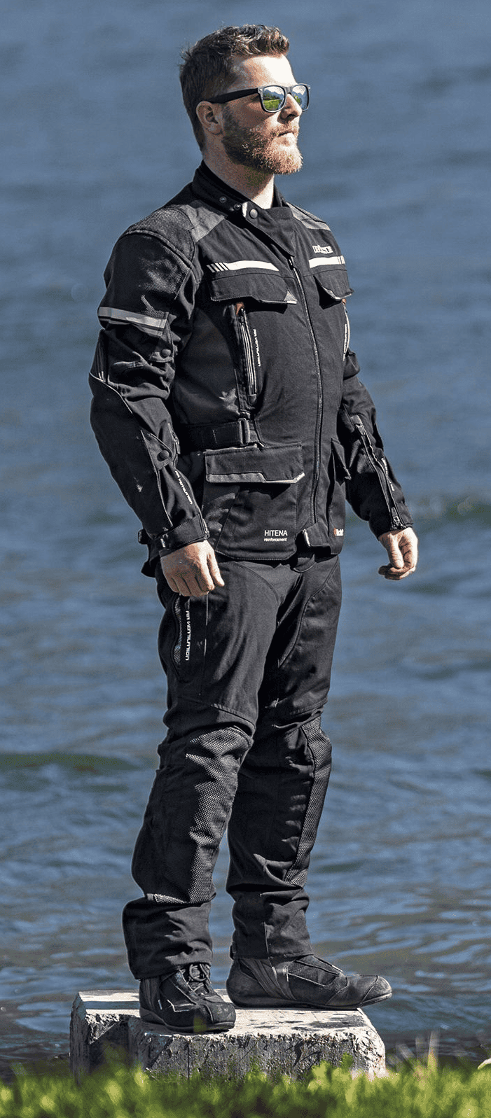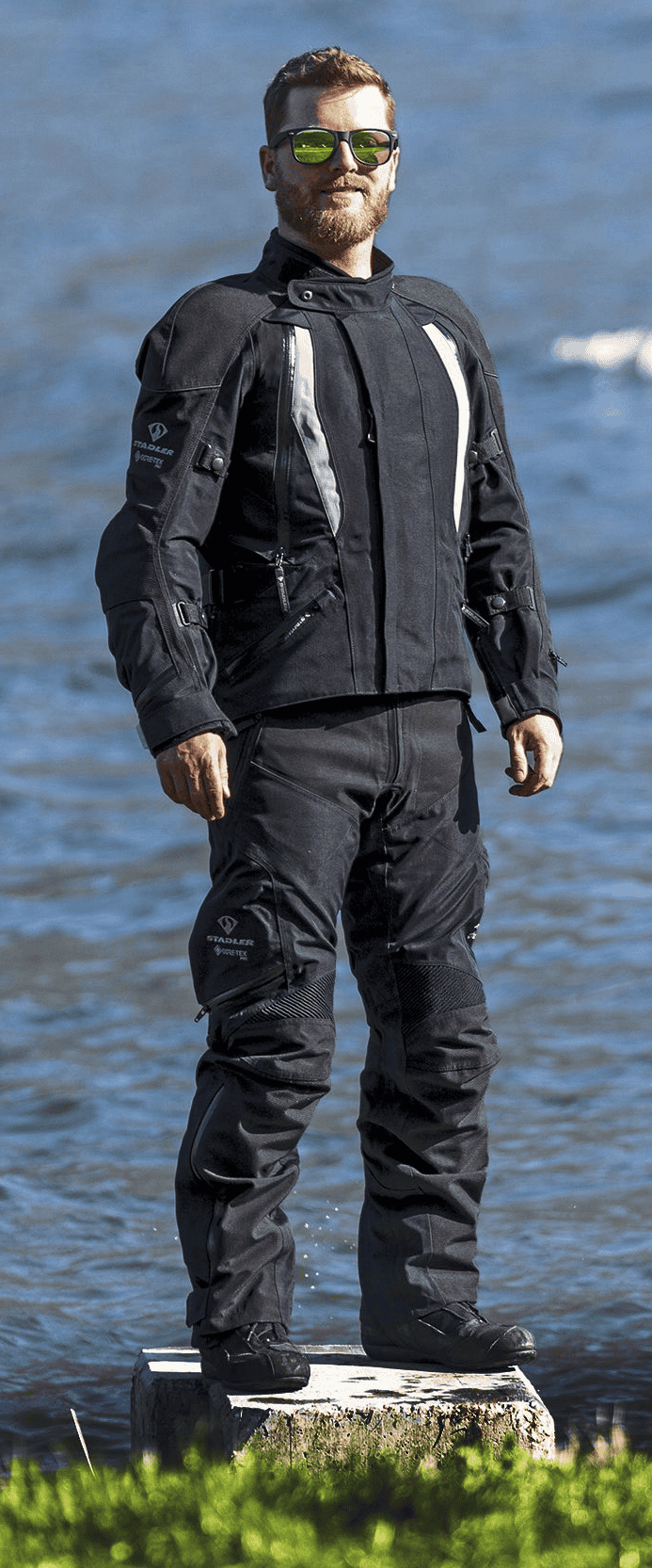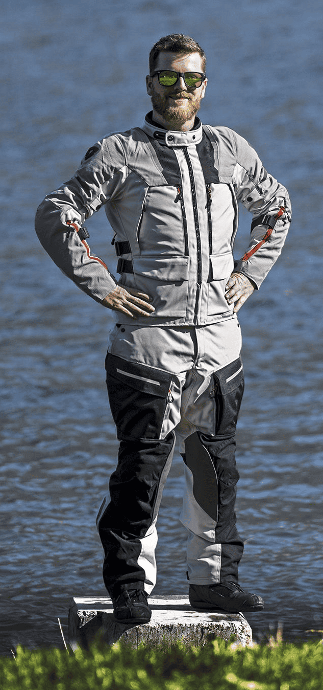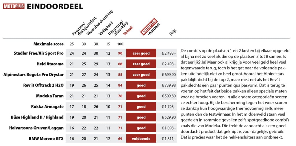 Universeel passend betekent dat naast de standaardmaten de combi’s ook verkrijgbaar zijn in een pasvorm voor ongebruikelijke lichaamsmaten. Naast de gangbare maten, meestal aangeboden in de range van 48 tot 66, omvat dit de zogenaamde korte-, buik- en lengtematen. Deze zijn ook geschikt voor motorrijders die relatief korte of lange ledematen hebben, of een ‘gezond’ buikje. Dat maakt de twee criteria ‘weersbescherming’ en ‘speciale maten’ direct de belangrijkste vereisten voor deze test. Zoals gezegd testen we negen pakken, te weten de Bogota Pro Drystar van Alpinestars, BMW’s Moreno GTX, Büse Highlands II en Highlands, Halvarssons Gruven en Laggan, Held Atacama, Modeka Taran, Rev’it Offtrack 2 H2O, Rukka Armagate en Stadler Free Sport Pro/Air Sport Pro.