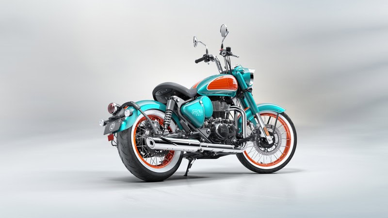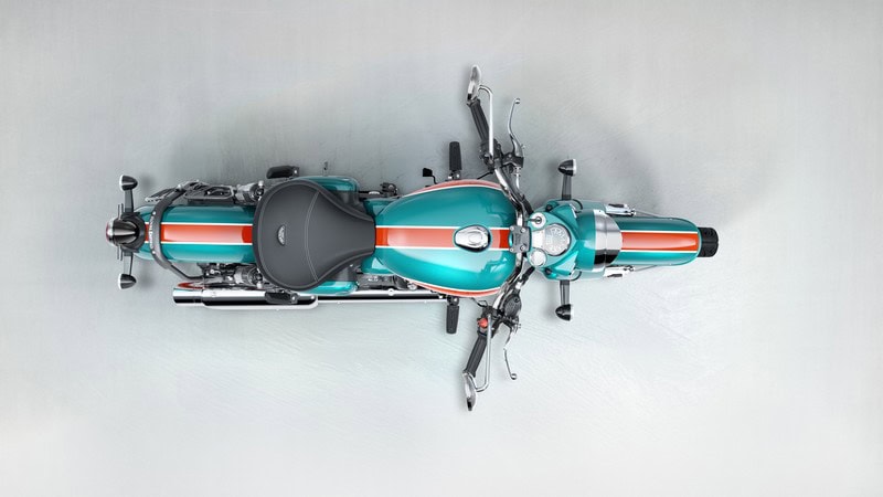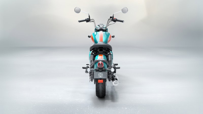 Het kleurenpalet van de Goan Classic 350 kan niemand ontgaan. De exclusieve kleur ‘Trip Teal’ is een combinatie van oranje en turquoise mandala-graphics, chroomaccenten en schuin afgesneden uitlaatdempers. Voor wie de motor wil personaliseren, zijn er volop op bobberstijl geïnspireerde accessoires te koop.