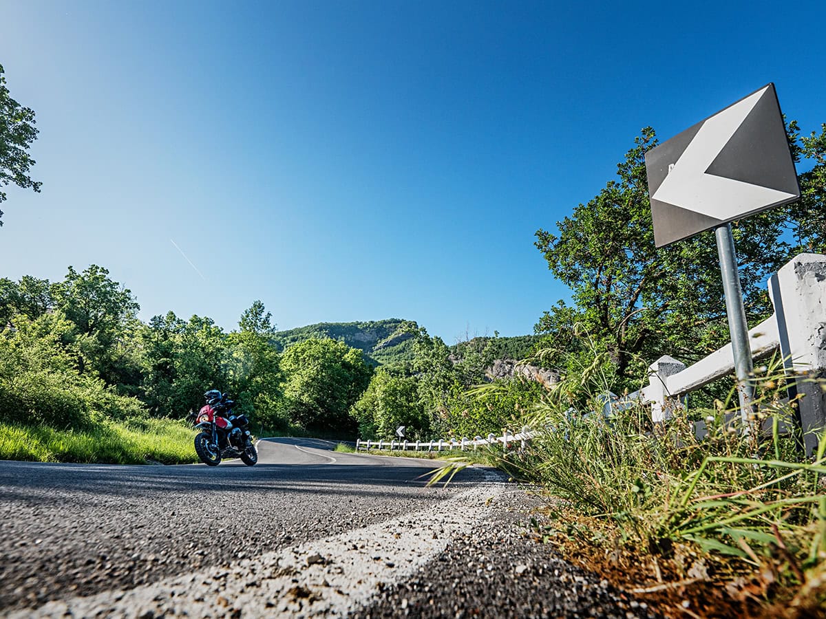Vanuit Tavullia zien we de Adriatische Zee al liggen en Rimini ligt op een steenworpafstand. Daar gaan we echter niet heen, de route via San Marino naar San Leo is voor motorrijders namelijk veel meer de moeite waard. Het ijs heeft ons afgekoeld en ontspannen cruisen we door de kustvlakte. Een piepklein weggetje duikt op en leidt ons naar de bergvesting van San Marino. Het weggetje is zo smal dat zelfs twee Fiat 500’s elkaar niet moeten tegenkomen. Flinke hobbels in de steile bochten zijn het bewijs van voertuigen die beter een andere route hadden kunnen kiezen, maar we zijn op de goede weg. Het lijkt alsof het plotseling allemaal draait om de bolletjestrui van de bergspecialist. Vier paar banden zoeken wanhopig naar grip, terwijl wij, de mannen aan het stuur, ons ziek zoeken naar de juiste lijn tussen de bochten. Eenmaal een haarspeldbocht uitkomend flikkert ineens de koplamp van Philippe’s Tracer in de achteruitkijkspiegel. En voor me het remlicht van Thierry. Hoe komt hij ineens weer voor me? Nou ja, de bolletjestrui is me blijkbaar niet gegund vandaag.