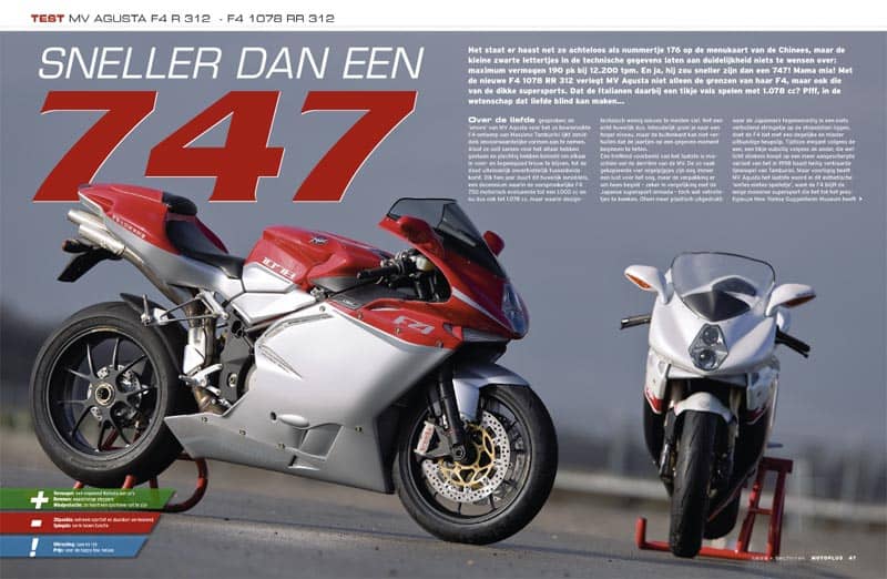 Het staat er haast net zo achteloos als nummertje 176 op de menukaart van de Chinees, maar de kleine zwarte lettertjes in de technische gegevens laten aan duidelijkheid niets te wensen over: maximum vermogen 190 pk bij 12.200 tpm. En ja, hij zou sneller zijn dan een 747! Mama mia! Met de nieuwe F4 1078 RR 312 verlegt MV Agusta niet alleen de grenzen van haar F4, maar ook die van de dikke supersports. Dat de Italianen daarbij een tikje vals spelen met 1078 cc? Pfff, in de wetenschap dat liefde blind kan maken…. Over de liefde gesproken; de ‘amore’ van MV Agusta voor het zo bewierookte F4-ontwerp van Massimo Tamburini lijkt inmiddels onvoorwaardelijke vormen aan te nemen. Alsof ze ooit samen voor het altaar hebben gestaan en plechtig hebben beloofd om elkaar in voor- en tegenspoed trouw te blijven, tot de dood uiteindelijk onverbiddelijk tussenbeide komt. Dik tien jaar duurt dit huwelijk inmiddels, een decennium waarin de oorspronkelijke F4 750 motorisch evolueerde tot een 1000 cc en nu dus ook tot 1078 cc, maar waarin designtechnisch weinig nieuws te melden viel. Net een echt huwelijk dus. Inhoudelijk groei je naar een hoger niveau, maar de buitenkant kan niet verhullen dat de jaartjes op een gegeven moment beginnen te tellen. Een treffend voorbeeld van het laatste is misschien wel de derrière van de MV. De zo vaak gekopieerde vier orgelpijpjes zijn nog immer een lust voor het oog, maar de verpakking er om heen begint – zeker in vergelijking met de Japanse supersport-armada – toch wat vetrolletjes te kweken. Ofwel meer plastisch uitgedrukt: waar de Japanners tegenwoordig in een niets verhullend stringetje op de strandstoel liggen, doet de F4 het met een degelijke en minder uitbundige heupslip.