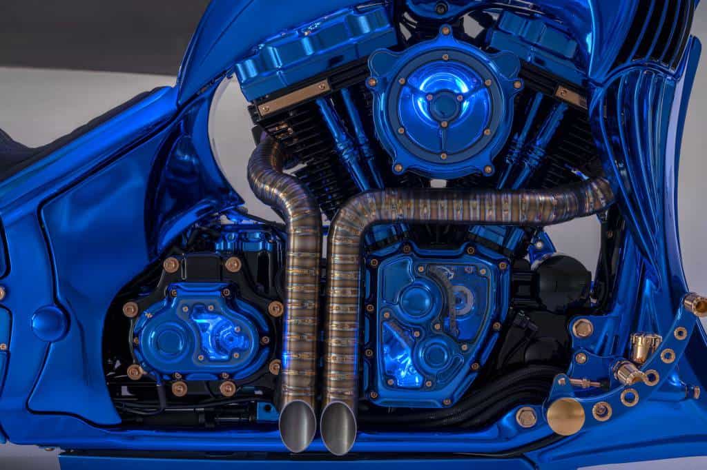 Om de bijzondere kleur te krijgen werd de motor eerst in het zilver gespoten om er vervolgens zes lagen van een speciaal ontwikkelde blauwe coating overheen te spuiten. In totaal is er ruim een jaar gewerkt aan het design en werden er meer dan 2.500 manuren in de Harley gestoken.