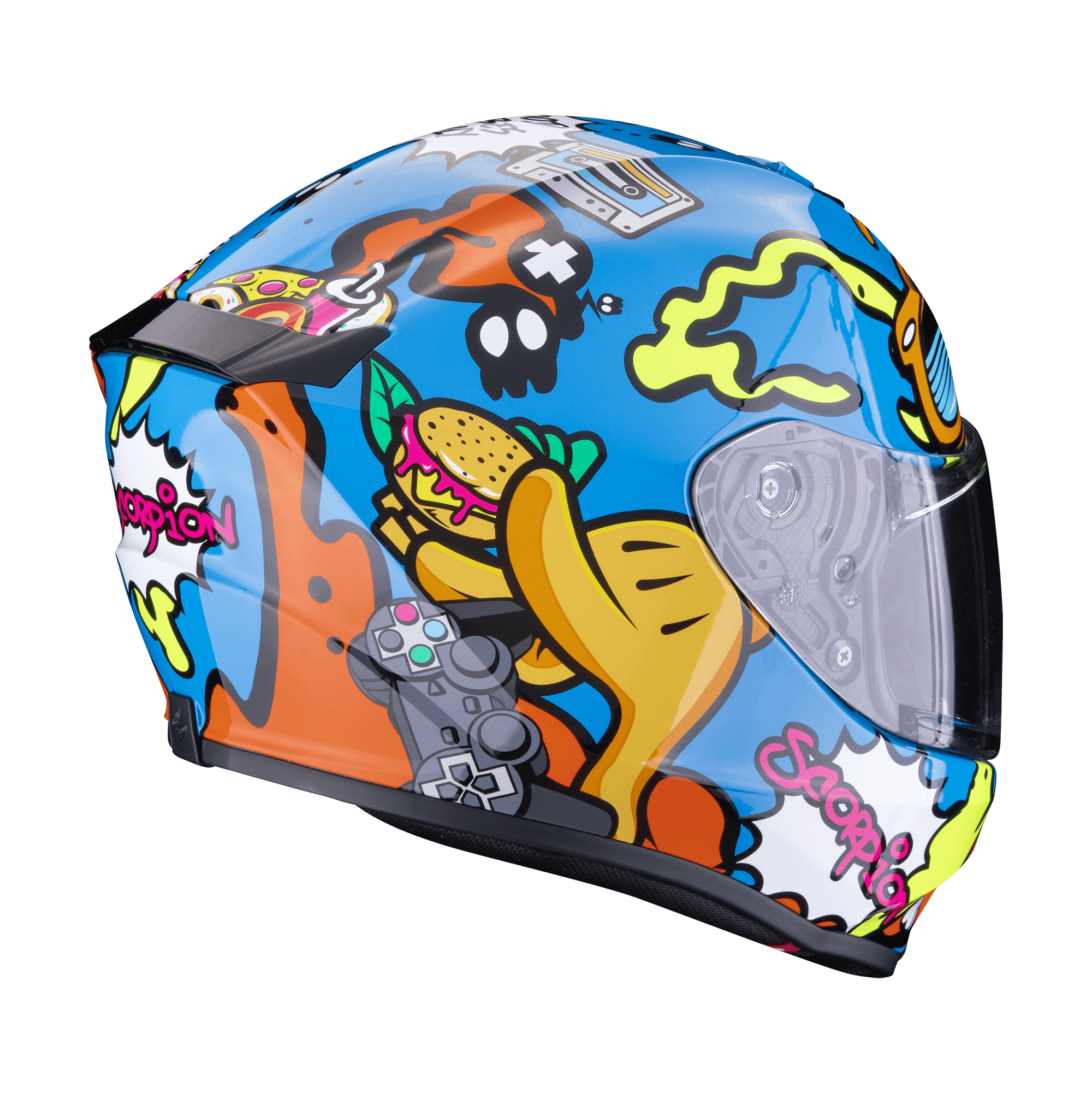 Frisse lucht voor het kroost wordt aangevoerd door makkelijk te bedienen ventilatieschuive en verder comfort is er in de vorm van het Quick Release/One Touch-systeem, waarmee de helm eenvoudig los te klikken is. Niets zo wispelturig als kinderen, dus komt de Scorpion EXO-JNR Air er in verschillende bijzondere designs, met voor ieder wat wils.