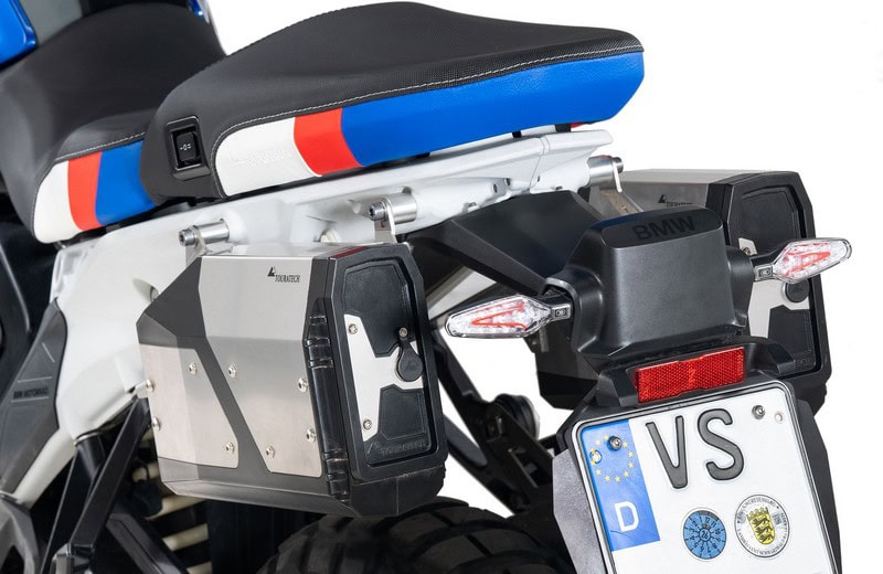 De afsluitbare, waterdichte en robuuste aluminium koffertjes moeten alles kunnen bevatten wat je op een (on)verharde dagtrip nodig hebt. Krentenbol, reserveband, een paar pleisters, wat gereedschap en een stuurslot. Handig dat je niet allemaal hoeft mee te slepen in een rugzak en handig dat je GS niet transformeert in een breed werkpaard. Je kunt de aluminium koffertjes desgewenst ook combineren met soft luggage.