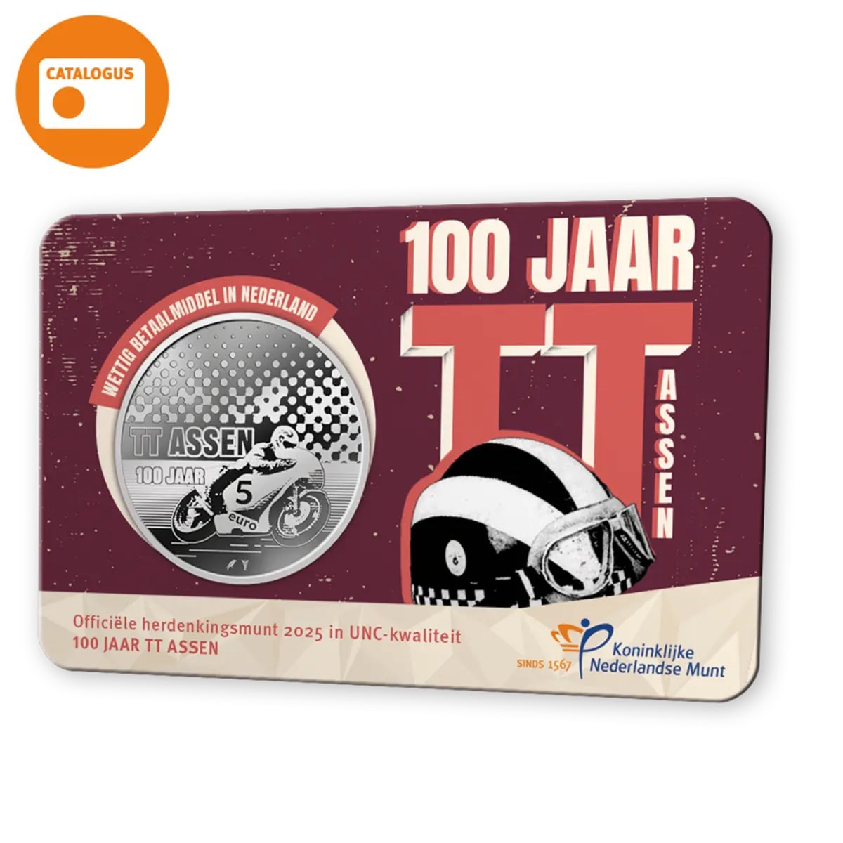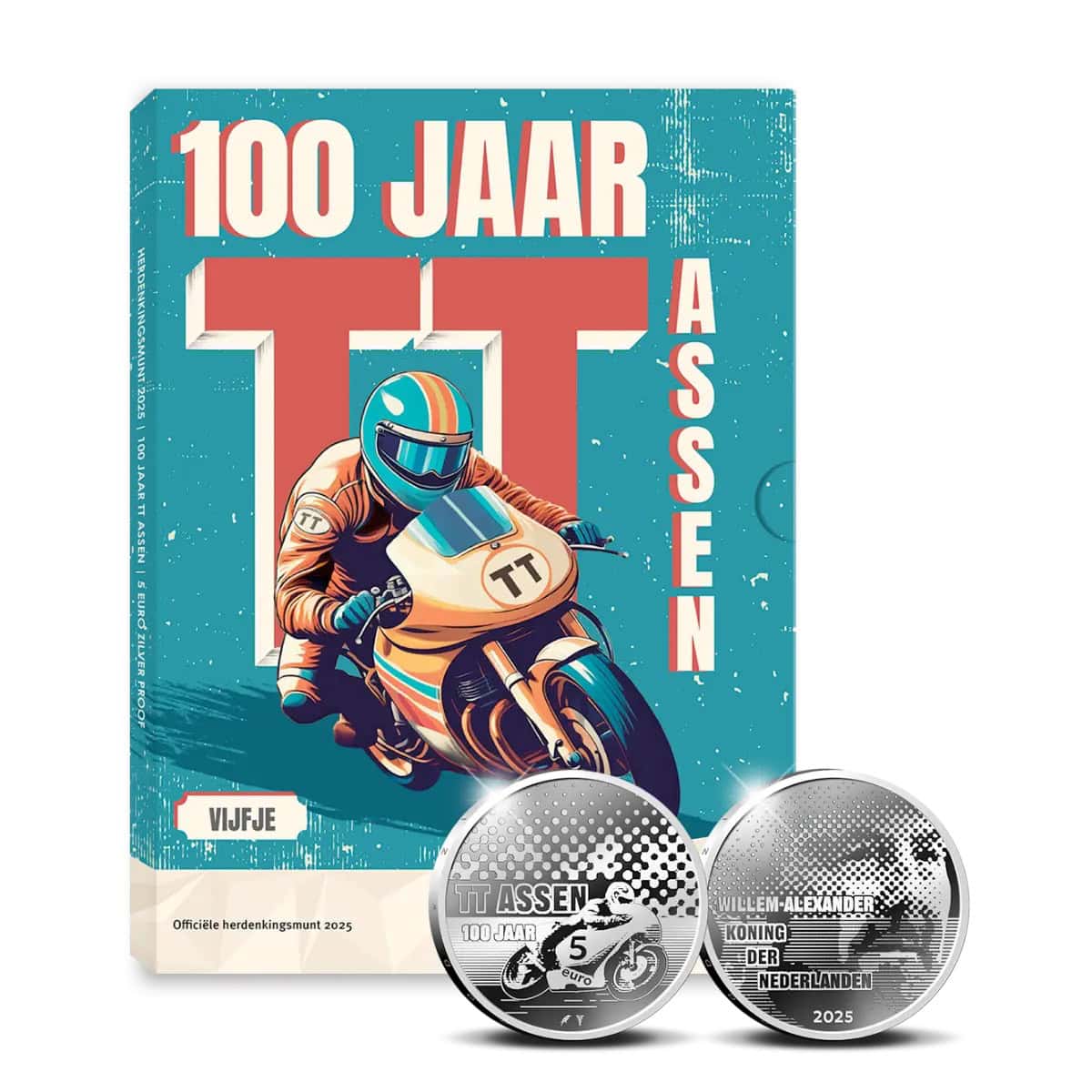 Deze officiële herdenkingsmunt is er in drie 5 euro munten: 100 jaar TT Vijfje 2025 UNC-kwaliteit in coincard (€ 5,-, oplage 50.000 stuks), 100 jaar TT Assen Vijfje 2025 BU-kwaliteit in coincard (€ 13,50, oplage 10.000 stuks) en als 100 jaar TT Assen Vijfje 2025 Zilver Proof (€ 56,95, oplage 3.500 stuks). Daarnaast is er een 100 jaar TT Assen 2025 Gouden Tientje (€ 875,-, oplage 750 stuks), die in een speciale cassette met certificaat van echtheid wordt geleverd.