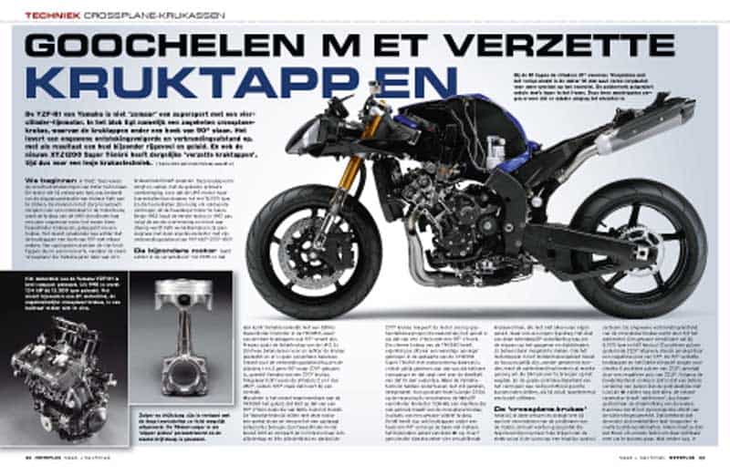 Foto’s/Tekeningen: Yamaha(eur_det_0009.jpg)Bys1Dit is de beroemde 270° krukas voor een viercilinder, zoals die voor het eerst in een serieproductiemotor is toegepast. We kijken er in rijrichting naar (dus van achteren), de primaire aandrijving zit rechts en cilinder 1 links. De krukas draait in dezelfde richting als de wielen, dus ‘voorover’. De ontstekingsvolgorde is 1-3-2-4 met als verbrandingsafstand 270°-180°-90°-180°.(eur_det_0010.jpg)Bys2Het motorblok van de Yamaha YZF-R1 is heel compact gebouwd. Uit 998 cc wordt 134 kW bij 12.500 tpm gehaald. Het meest bijzondere aan dit motorblok, de ongebruikelijke crossplane-krukas is van buitenaf echter niet te zien.(eur_det_0006.jpg)Bys3Zuiger en drijfstang zijn in verband met de hoge toerentallen zo licht mogelijk uitgevoerd. De 78 mm zuiger is als ‘slipper piston’ geconstrueerd en de slanke drijfstang is gesmeed. (stu_0002.jpg)Bys5Bij de R1 liggen de cilinders 31° voorover. Vergeleken met het vorige model is de motor 12 mm naar voren verplaatst voor meer gewicht op het voorwiel. De achtervork scharniert enkele mm’s lager in het frame.