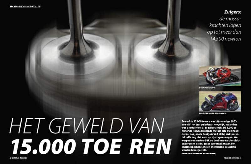 Een echte 15.000 toeren was bij sommige 600’s van vijftien jaar geleden al mogelijk, maar dan was de fut er wel al zo’n beetje uit. De 1.000 cc metende Honda Fireblade met de drie R-en haalt dat nu ook, en de Panigale V4R zit bij dat toerental zelfs nog niet eens op zijn topvermogen. We werpen een nadere blik op de diverse motorblokonderdelen die bij zulke toerentallen aan een enorme mechanische en thermische belasting bloot worden gesteld.