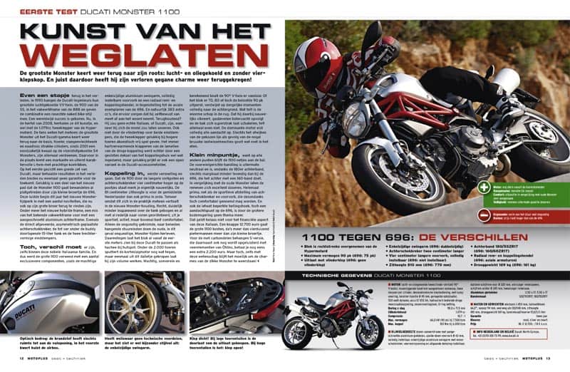 Twee kleppen per cilinder, da’s meer dan genoeg. Voor een Monster. Dat onderkent Ducati nu ook en dus sturen ze de Monster 1100 als opvolger van de S2R als familiehoofd de weg op met twee kleppen per cilinder en zonder radiateur, slangen of andere fratsen.Het blijft altijd afwachten als een motorfiets met een jarenlange staat van dienst compleet wordt vernieuwd. Bij de Monster-serie had de M 696 het fletser wordende blazoen al met de nodige bravoure opgepoetst en dat heeft de verwachtingen ten opzichte van de 1100, die optisch nog meer indruk maakt, verder aangewakkerd. De nieuwe 1100 tracht zich te beperken tot de essentie, onder het motto ‘minder is meer’. Strakke lijnen, keurig weggewerkte kabels en leidingen, geen overvloedige bling. Zelfs de altijd wat patserig overkomende voorste uitlaatdemper is onder de swingarm weggemoffeld.De gespierde Monster 1100 staat ontslakt en afgetraind op zijn lichtgewicht Marchesini-wielen. En al kan de platgedrukte koplamp misschien niet iedereen bekoren, de enkelzijdige swingarm in superbike-stijl staat hem zonder meer uitstekend.In het midden prijkt de luchtgekoelde V2 die in zijn huidige ontwikkelingsstadium (zie kader op pagina XX) 1078 cm3 groot en – volgens fabrieksopgave – 90 pk sterk is. Dat lijkt niet zo veel in de huidige tijd, eerder bescheiden. Koelribben versus maximale power: een zelfbewust statement dat rijplezier niet wordt gedefinieerd door topprestaties, maar door voldoende vermogen op de juiste momenten. En dat zou deze tweeklepper allemaal moeten kunnen leveren.Dat de 1100 van een ander kaliber is dan zijn kleinere broertje, valt onmiddellijk op bij het opstappen.