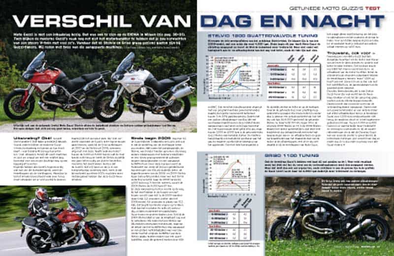 Dat geldt ook voor de zuigerbodems die via sproeiers extra olie toegevoerd krijgen. Om dat allemaal voor elkaar te krijgen zijn er twee co-axiaalpompen gemonteerd die met een capaciteit van 25 liter per minuut de thermische huishouding van de vette V-twin binnen de grenzen van het betamelijke moeten houden. In deze context zijn de oliekanalen in het carter zo gelegd dat ze zo ver mogelijk van de hete uitlaatbochten lopen.[UNTERSCHRIFTE]De nieuwe motor is op zes plaatsen aan het frame geschroefd. Nog altijd groot en machtig. Ondanks de vierklepstechniek breekt Guzzi niet met zijn verleden, het blijft een luchtgekoelde 90º V-twin.________________________________________[KASTEN AUFGEFALLEN]EN VERDERPlusZicht: relatief goede kijk naar achteren door de breed uitstaande spiegels. Pas vanaf de 6.000 tpm verstoren de vibraties de blik naar achteren.Zithoogte: door een eenvoudig maar ingenieus systeem is de buddy in hoogte verstelbaar.Verlichting: de schakelaar voor extra mistlampen is al aanwezig.MinAfwerking: slordig weggewerkte kabels, slecht lakwerk, een loslatende afdichting van een zijvak en niet van bramen ontdane hoeken, lieten geen goede indruk achter.Panne: tijdens een rit in de regen vielen de snelheidsmeter en boordcomputer tijdelijk uit en haperde de motor.Olie bijvullen: om bij de vuldop met peilstok te komen moet er eerst een afdekkap worden verwijderd. Dat is met een heet blok een hele onderneming, aangezien de hete uitlaatbocht er pal naast zit.VERINGINSTELLINGEN(secundaire weg)VOORVORKUitgaande demping 2 omwentelingenIngaande demping 1 ½ clicksVeervoorspanning 8 omwentelingenBandenspanning 2,5 barACHTERSCHOKDEMPERUitgaande demping 13 clicksVeervoorspanning 20 omwentelingenBandenspanning 2,9 bar(Alle cliks en omwentelingen geteld vanuit volledig dichtgedraaide positie.)________________________________________[KASTEN TECHNISCHE DATEN]MOTOR lucht- en oliegekoelde tweecilinder viertakt 90° V-motor, bovenliggende ketting aangedreven nokkenas, vier kleppen per cilinder, klepbediening via tuimelaars, wet-sump smering, benzine-injectie Ø 50 mm, geregelde katalysator, 550 watt dynamo, accu 12V/18Ah, hydraulisch bediende enkele droge plaatkoppeling, zesversnellingsbak, cardan, secundaire overbrenging 3,667.Boring x slag 95,0 x 81,2 mmCilinderinhoud 1.151 ccCompressie 11,0 : 1Max. vermogen 77,0 kW (105 pk) bij 7.500 tpmMax. koppel 108 Nm bij 6.500 tpmRIJWIELGEDEELTE stalen brugframe, upside-down voorvork Ø 50 mm, volledig instelbaar, CARC enkelzijdige aluminium swingarm met hevelsysteem, volledig instelbaar, dubbele schijfrem voor Ø 320 mm, vierzuiger remklauwen, schijfrem achter Ø 282 mm, dubbelzuiger remklauw.Spaakwielen 2.50 x 19; 5.50 x 17Bandenmaat 110/90ZR19; 180/55ZR17Banden in test Pirelli Scorpion SyncMATEN EN GEWICHTEN wielbasis 1.535 mm, balhoofdhoek 63,0°, naloop 125 mm, veerweg v/a 170/155 mm, maximum toelaatbaar totaalgewicht 475 kg, tankinhoud/reserve 18,0/4,5 liter.Service-intervallen elke 10.000 kmOlie- en filterwissel elke 10.000 kmStationair toerental 1.100 ± 100 tpmBandenspanning solo v/a 2,5 / 2,8Bandenspanning duo v/a 2,5 / 2,8Garantie twee jaarKleuren rood, wit en zwartPrijs NL € 14.862,- / B € 13.490,-INFO NEDERLAND EN BELGIË Moto Tricolore BV, www.mototricolore.nl________________________________________[KASTEN MOTOPLUS METINGEN] MOTOR¹Vermogen in kW/pkMotortoerental x 1.000 tpmKoppel in Nm76,6 kW (104 pk) bij 7.800 tpm105 Nm bij 6.600 tpmVERSNELLINGSBAKSnelheid in km/uurMotortoerental x 1.000 tpmNom. toerentalMax.