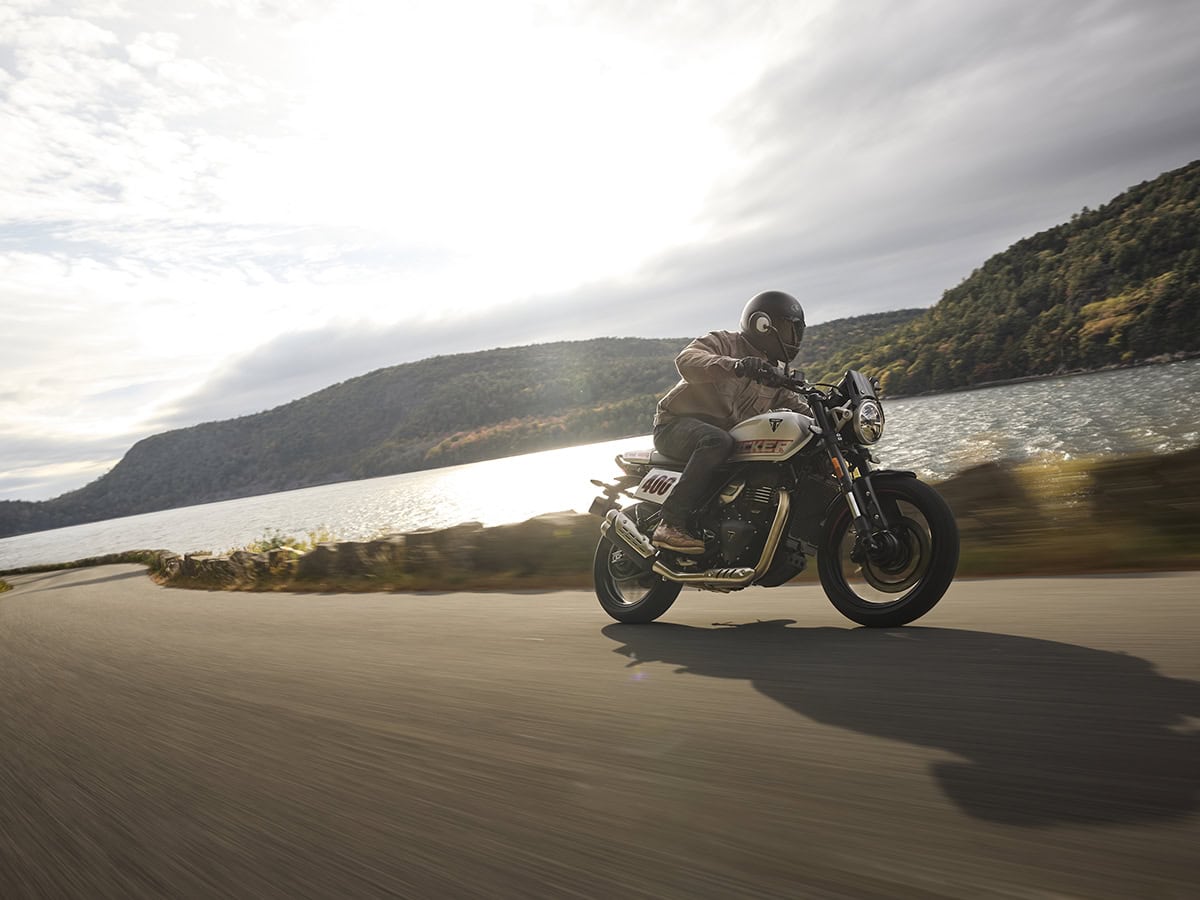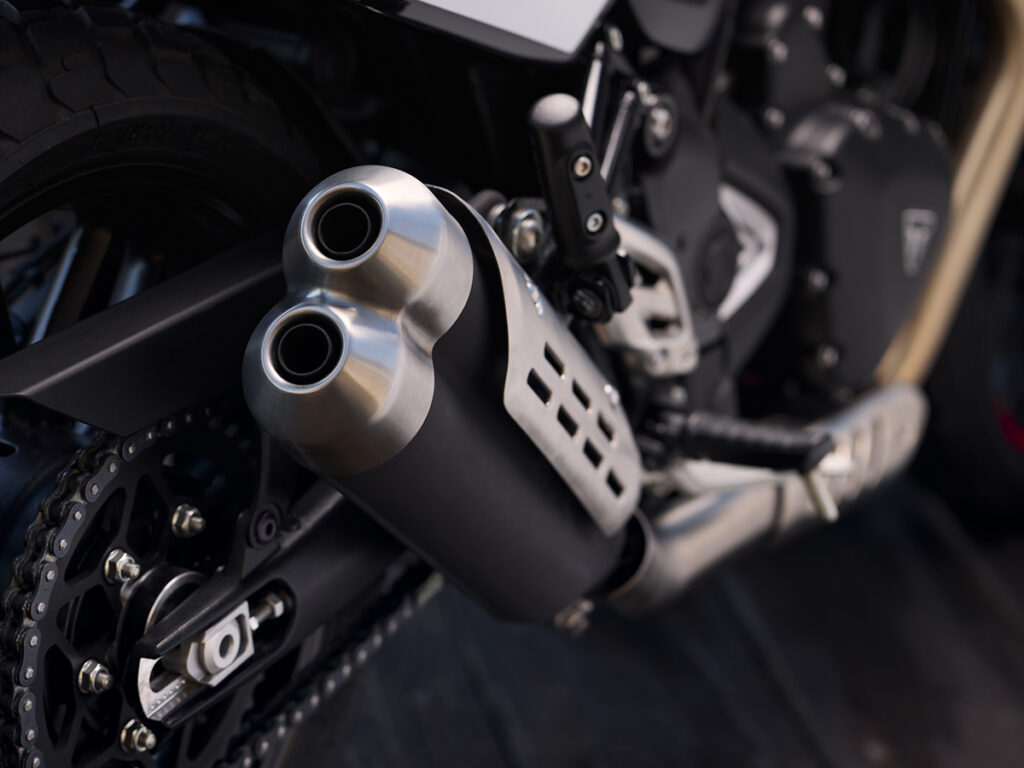 Volgens Triumph is er ook wat aan het rijwielgedeelte gesleuteld, al veranderen de technische specificaties niet of nauwelijks. De zithoogte stijgt door een ander zadel van 790 naar 805 millimeter en de balhoofdhoek en naloop veranderen op papier met minimale waarden: de balhoofdhoek is 0,2 graden steiler, de naloop 0,5 millimeter korter. Een verschil dat je in de praktijk niet zult merken. Dit in tegenstelling tot de aangepaste ergonomie, die met een 23 millimeter breder en daarnaast ook vlakker stuur in combinatie met de hoger en verder naar achteren geplaatste voetsteunen duidelijk meer sportief uitvalt.