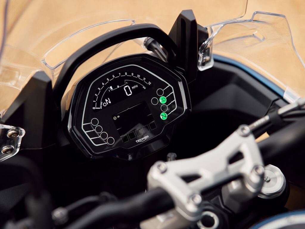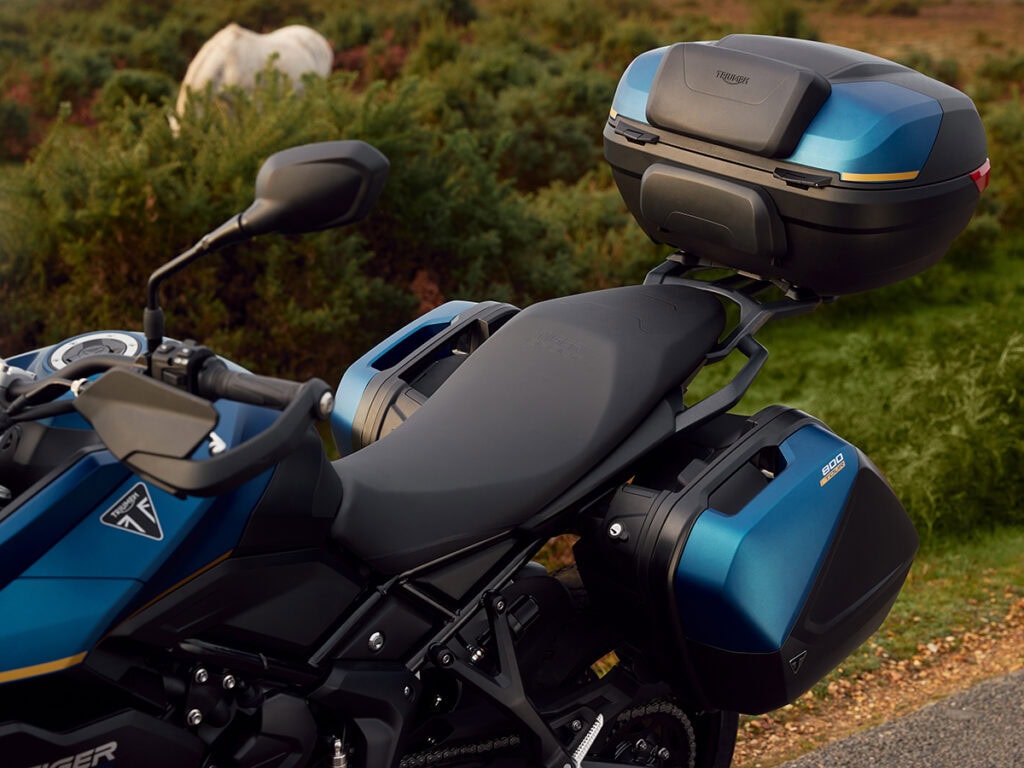 Dat ‘kracht van onderuit-karakter’ past perfect bij het crossoverconcept en misschien nog wel beter de nieuwste exponent op het Tiger Sport 800-platform: deze nieuwe Tiger Sport 800 Tour. Deze borduurt voort op de bestaande basis rond een stalen buizenframe met deels instelbare Showa vering voor en achter (veerweg v/a 150/150 mm), maar is behoorlijk wat rijker uitgerust dan de basisversie. Gezien de toevoeging in de typenaam zal het niemand verbazen dat die uitrusting met name de praktische reiskwaliteiten van de Brit nog wat verder uitdiept. De Tour is namelijk standaard uitgerust met een middenbok, handvatverwarming, handkappen, comfortzadel en elektronische bandenspanningscontrole. Daarnaast is ook een driedelige top- en zijkofferset in kleur standaard aan boord. Deze slikt in totaal 106 liter aan bagage weg, ruim voldoende voor een flinke vakantie!