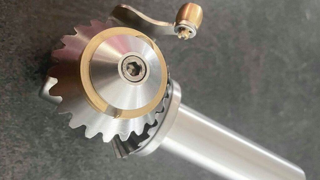 Misschien wel het mooiste gashendel ter wereld heeft Mario Hartmann’s firma Inmaxwetrust in de aanbieding. Deze Maxthrottle 1 is feitelijk een onderdelenkit bestaande uit rvs, messing, aluminium en bronzen componenten, met als glanzend middelpunt de twee naaldgelagerde kegeltandwielen van molybdeen. Die laatste twee zijn precisiewerk uit Zwitserland, de rest van de kit wordt in Oostenrijk vervaardigd. Samengevoegd is het een waanzinnig fraai mechaniek met een enorme esthetische waarde, zeker op een karaktervolle retro of stoere cruiser.