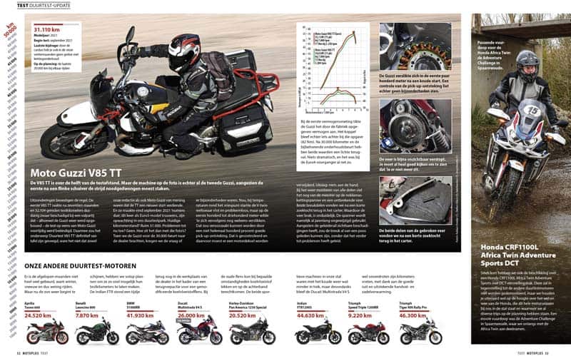 En zo maakte eind september 2021 ‘numero due’, dit keer als Euro5-model trouwens, zijn opwachting in ins duurtestpark. Huidige kilometerstand? Ruim 31.000. Problemen tot nu toe? Geen. Hoe zit het dan met die foto’s? Toen we de Guzzi voor de 30.000-beurt naar de dealer brachten, kregen we de vraag of er bijzonderheden waren. Nou, bij temperaturen rond het vriespunt start de V-twin weliswaar vlot en probleemloos, maar op de eerste honderd tot driehonderd meter wilde ‘ie zich vervolgens nog wel eens verslikken. Dat zou veroorzaakt kunnen worden door niet helemaal honderd procent goede pick-up-ontsteking. Dat is gecontroleerd en daarvoor moest er een motordeksel worden verwijderd. Uitslag: niets aan de hand.