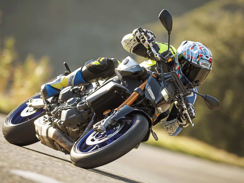 De combinatie van de volledig instelbare KYB voorvork en hoogwaardige Öhlins schokdemper van de Yamaha MT-09 SP gaat wat dat aangaat net zo soeverein te werk, zijn het iets minder fijngevoelig. De vering geeft veel feedback, maar reageert iets minder gevoelig dan de Honda, vooral aan de voorkant. De Yamaha toont op zijn beurt een lichtvoetigheid waar de Honda en Triumph alleen maar van kunnen dromen. De vierde versie van de MT stuurt als vanzelf de bocht in, waarbij de zeven extra kilo’s ten opzichte van de Triumph dan wel op de weegschaal mogen staan, op de weg zijn ze nergens te bekennen. Op bijzonder smalle wegen is de MT de eerste keus, waarbij de Triumph en Honda alle zeilen moeten bijzetten om hun concurrent niet uit het oog te verliezen. Met een sonoor gebrul dirigeert de triple het vermogen genadeloos naar het achterwiel, waarbij de Yamaha schijnbaar moeiteloos uit de bocht wordt gekatapulteerd, alsof de zwaartekracht even niet bestaat. Zelden was snelheid en vermogen zo moeiteloos oproepbaar.