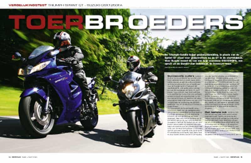 En sterk is ‘ie ook, alleen jammer dat het blok nogal vibreert. Compensatie is er in de vorm veel comfort en mooi doordachte toerdetails. Op lange snelwegritten gaat er niets boven de Kawasaki 1400GTR. Windbescherming en zadel overtuigen, de potente viercilinder doet de rest. Wel stuurt de GTR wat zwaar. Een auto op twee wielen wordt Honda’s GoldWing wel eens genoemd, maar daarmee doe je deze luxe toermachine te kort. Hij swingt opvallend lichtvoetig door het bochtenwerk en heeft een verslavende zescilinder in het vooronder. De Triumph Sprint GT is toeristischer dan de Sprint ST, maar duidelijk sportiever dan de andere motoren in deze test. Zijn elastisch aanvoelende driepitter draait graag wat meer toeren, de zit is een stukje sportiever en ook de windbescherming is wat minder effectief. De Suzuki GSX1250FA Touring Edition is in de praktijk een beresterke en heel uitgebalanceerde machine, ideaal voor toeren.